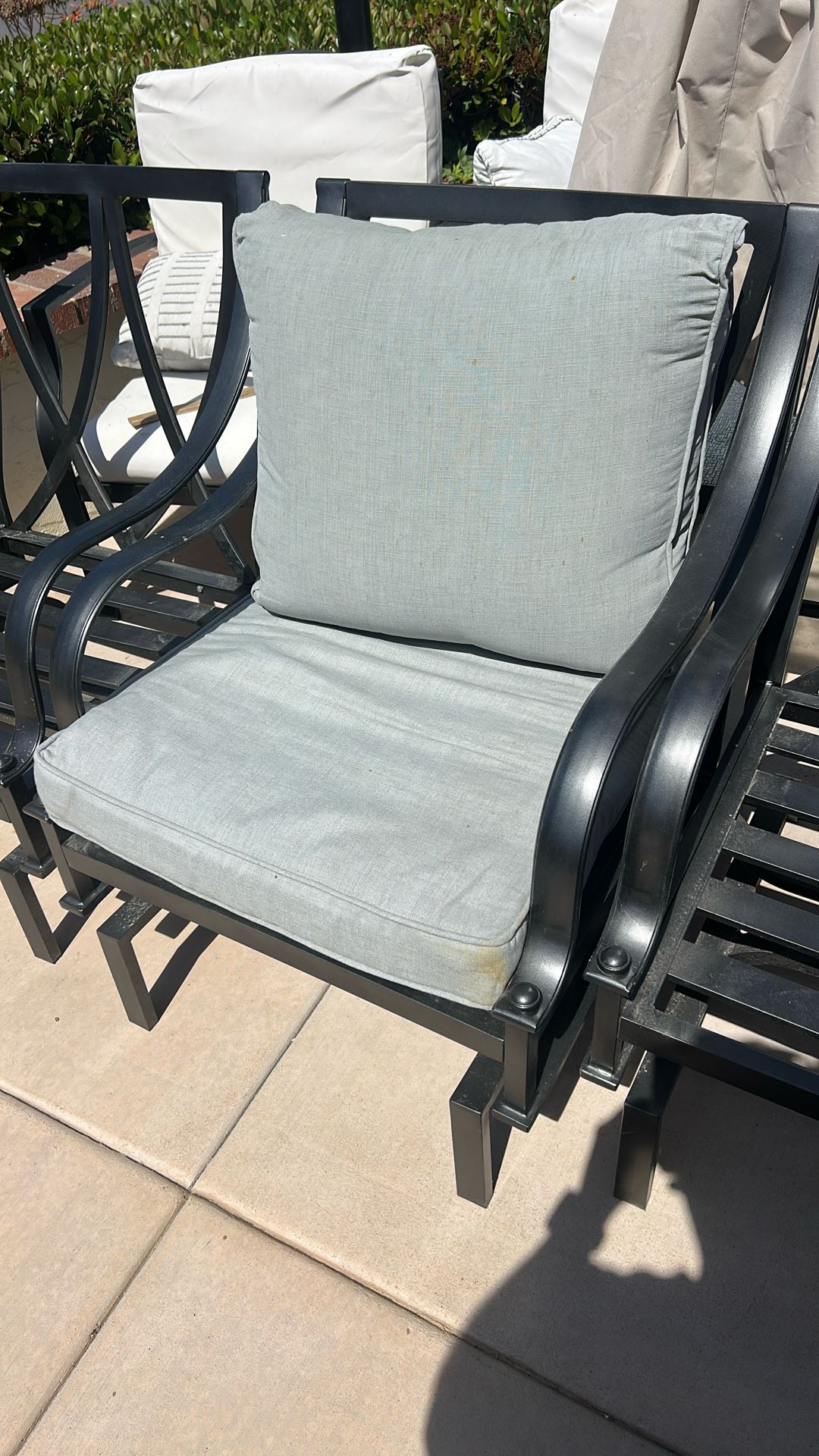 Hampton-Bay cast aluminum chairs rocker chairs. Selling for a great price due to the fact that the cushions need to be replaced or re-covered. . (See pictures for dimensions). Not shown is the height of the chair which is 13” from the ground to the seat for the cushion. $50 includes all 4 chairs