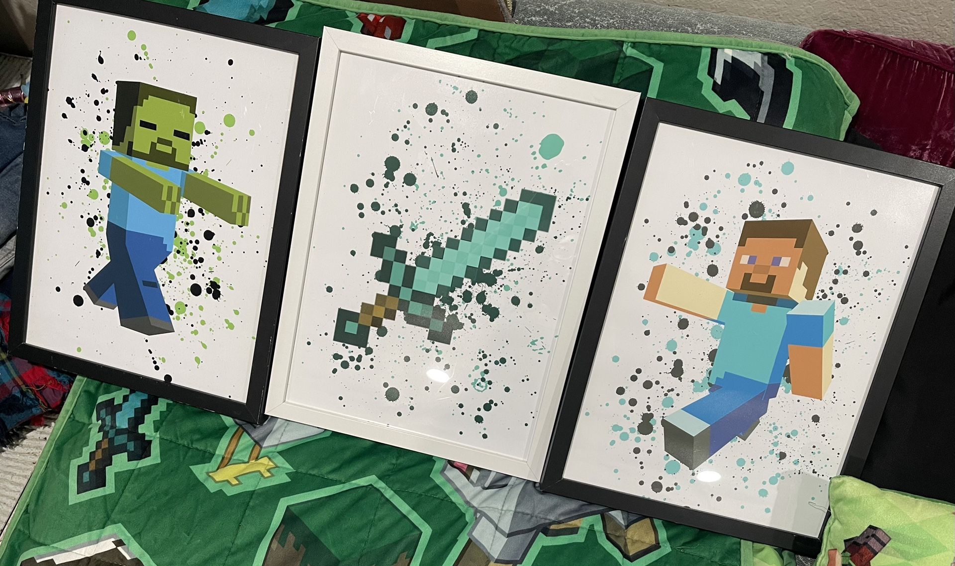 *MUST GO ASAP* Creeper plushy - $10 Creeper night light (needs batteries) - $5 4 small pillow cases (various Minecraft prints) - $5 Weighted Minecraft throw blanket - $25 3 frames Minecraft wall art - $25 Everything for $50 Or you can let me know what you are interested in. (The Minecraft bedding set is sold. But I still have all the other bedroom accessories listed available.)
