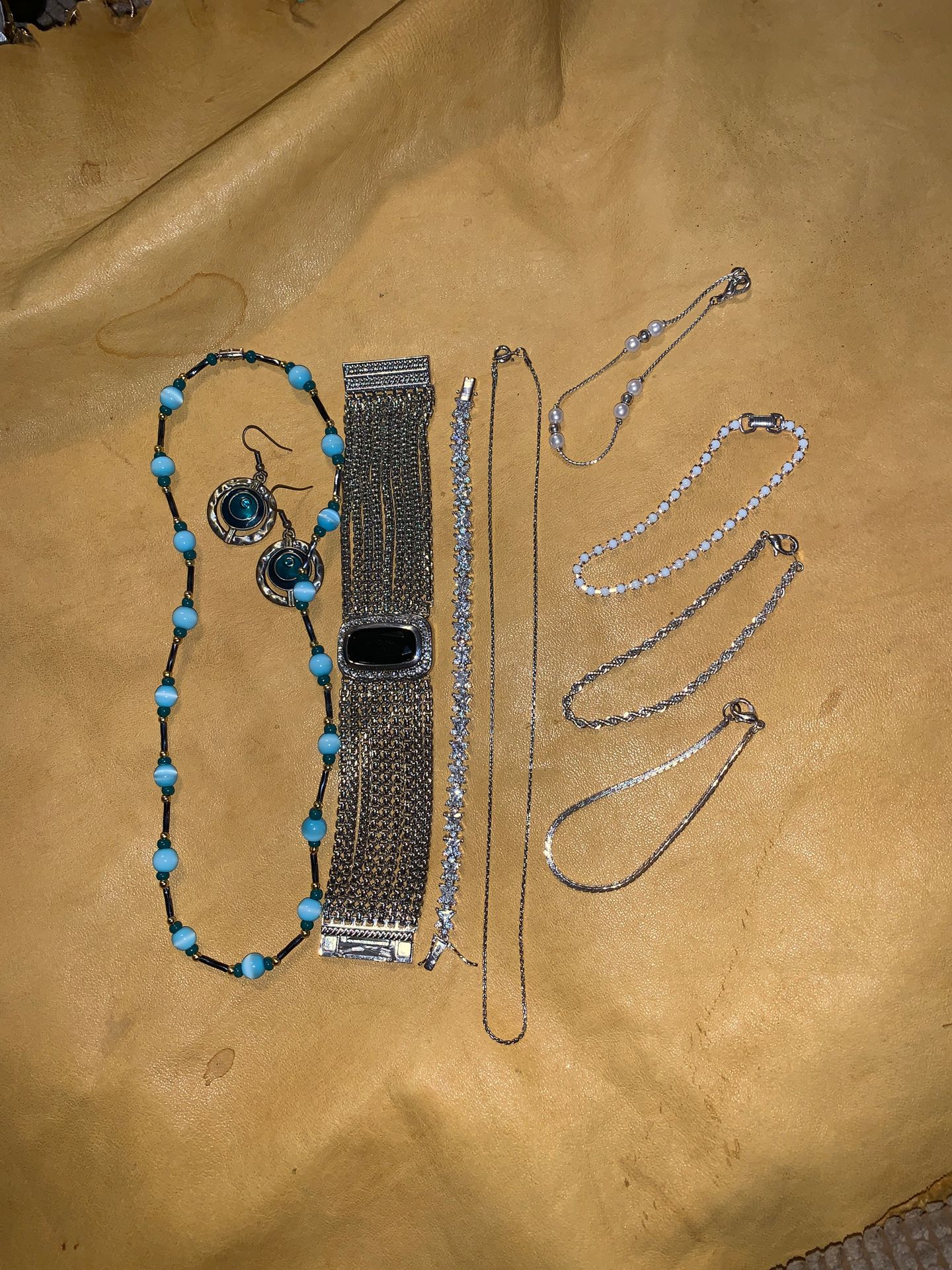 This is lot being sold 2 necklaces, 6 bracelets and 1 pair of earrings. Earrings are a brass color, the rest are silver plated or silver colored metal. Pick up in Taylorsville no delivery no trades.