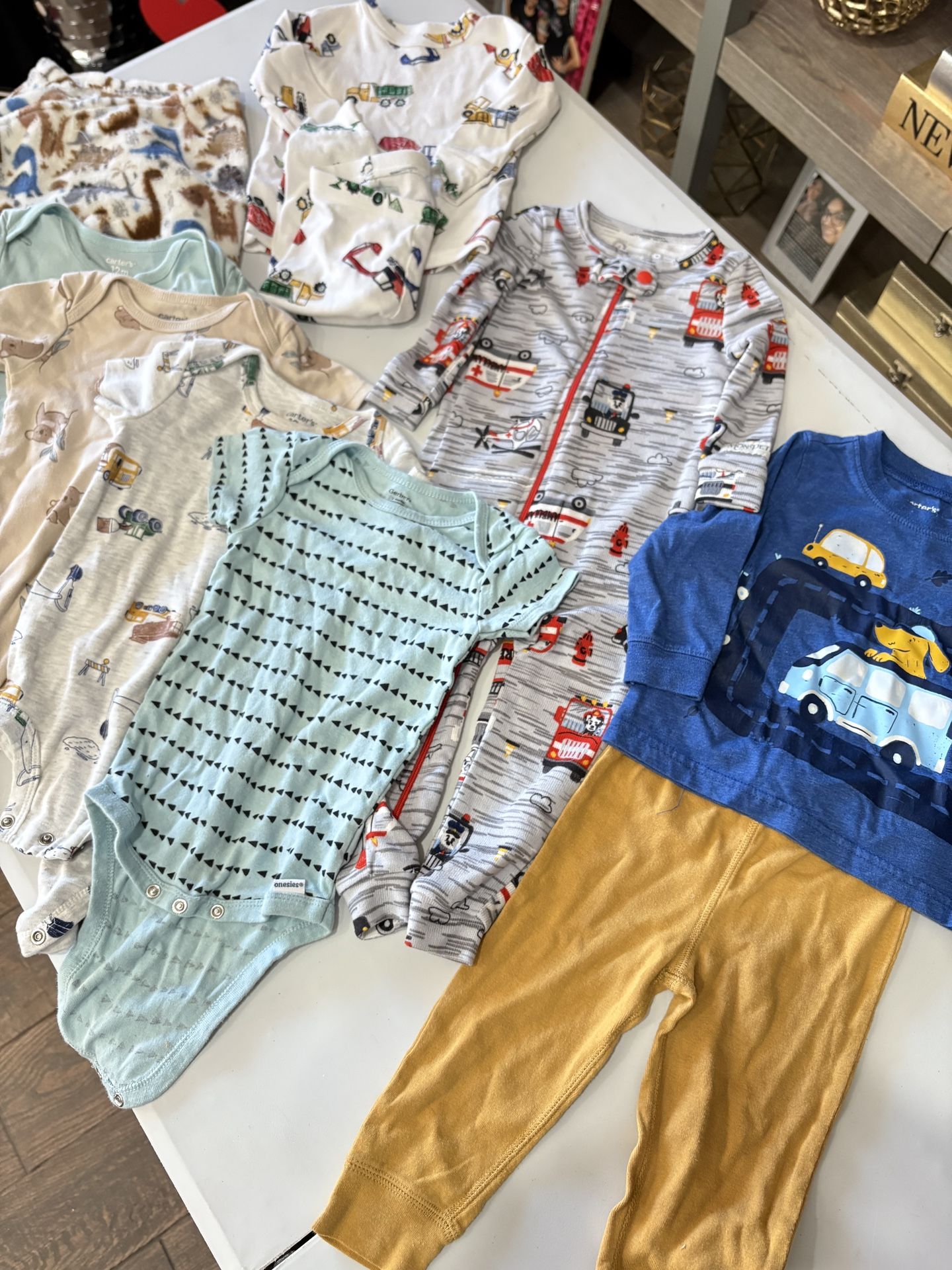 Selling entire bundle of 10 pieces for $30 4 onesies GAP 2-piece pjs 1 fire truck pjs 1 blue top & mustard 2-piece 1 swaddle sack Pick up- Higley & Baseline