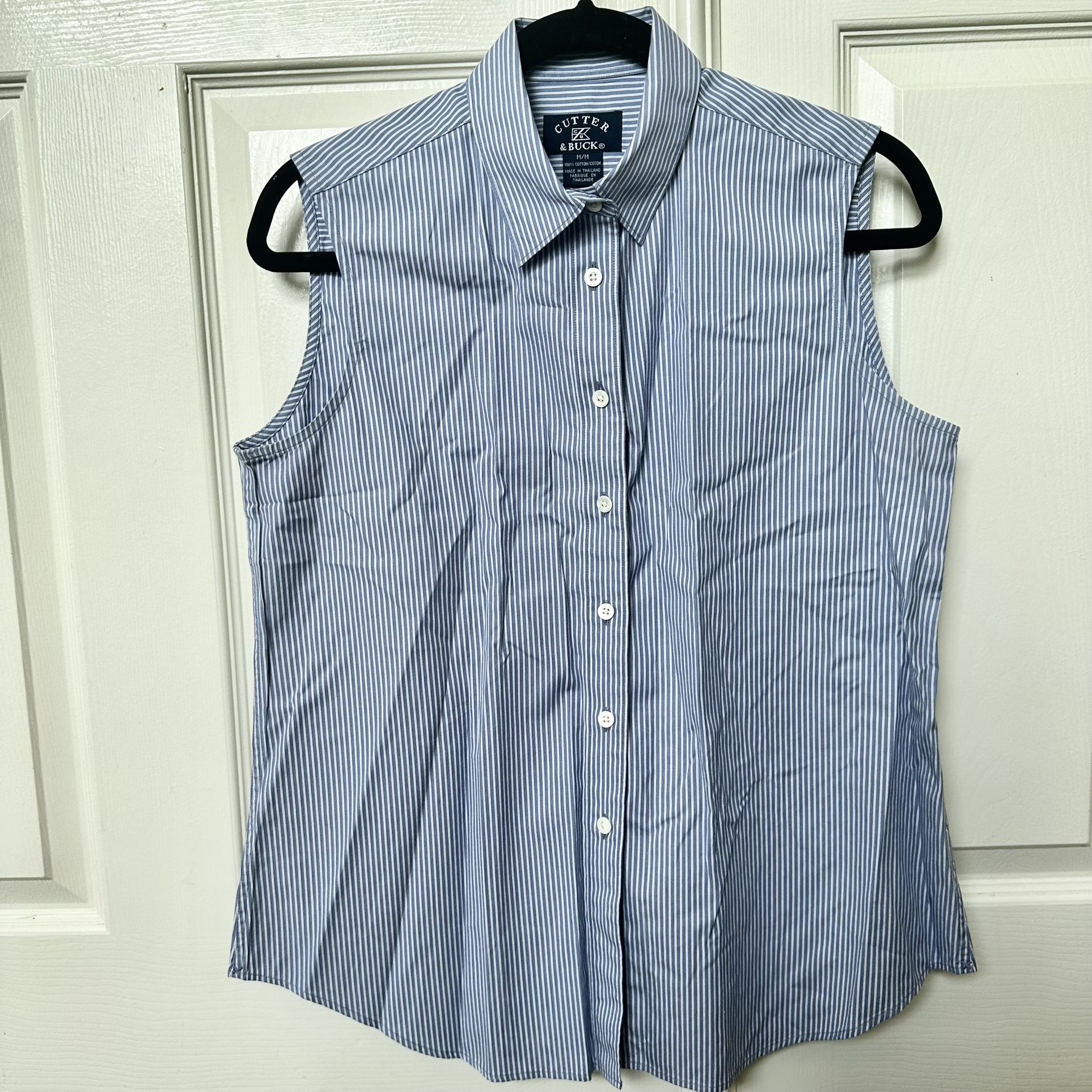 Cutter & Buck blue and white stripe sleeveless button down shirt This shirt is so great to wear under a blazer/jacket- no need for sleeves Excellent condition Collared Button down Very open to reasonable offers - I always try to accept offers or counter or work with you on an amount that works for both of us :) Fast shipping Bundle to save - the more you bundle, the bigger the discount I usually include a gift on 3+ bundles Please see photos. They are part of the description Happy to answer any questions- I am usually on line other than when I’m sleeping lol Check out my other listings - lots of jewelry! New listings every day Thanks for stopping by !