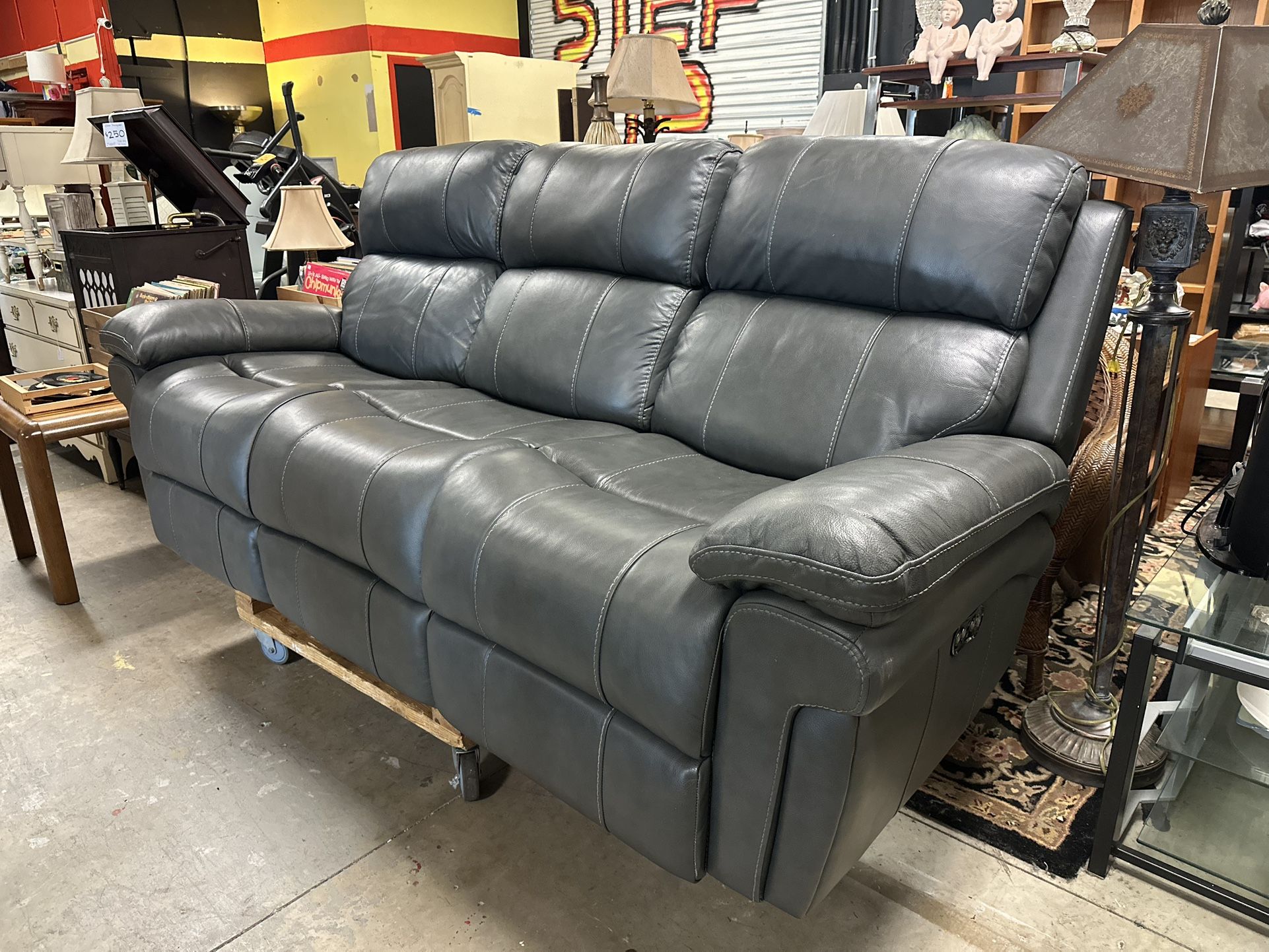 Beautiful grey leather couch with powered reclining seats and single USB ports on both sides. Perfect for your living room movie nights! 🍿 84 inches long x 39 inch tall x 39 inches deep  Visit Market Me Resale- where we have quality is used furniture, antiques, decor collectibles, and more. Located right next-door to Bronstein Auction Co in Longwood, FL. Here’s our address: 700 S. US Hwy 17 92 Longwood Fl 32750. Hours: Mon-Thurs 10 am-6 pm Fri-Sun 10 am - 4 pm
