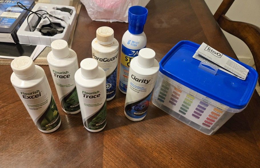Looking to get rid of supplies all at once if possible. Asking $50 because the driftwood is real and already professionally mounted to weighted slate. The soil in the circle tub is also Fluval Stratum. Hygger light, up to 30in extendable. Partially used but mostly full Seachem chemicals. Tetra water testkng kit. 2.5gal Lowe's bucket that has been the best tool for me so far.