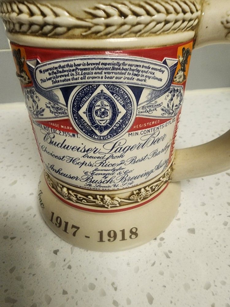 In like new condition. This limited edition Stein was released at the 1998 Anheuser-Busch State Convention in St. Louis. It commemorates the 1st Budweiser Labels printed entirely in English (1(contact info removed)). Trending on Etsy and EBAY for $20-$35 plus shipping. Pickup at The Madison Apartments in Charlotte, NC 28227 area.