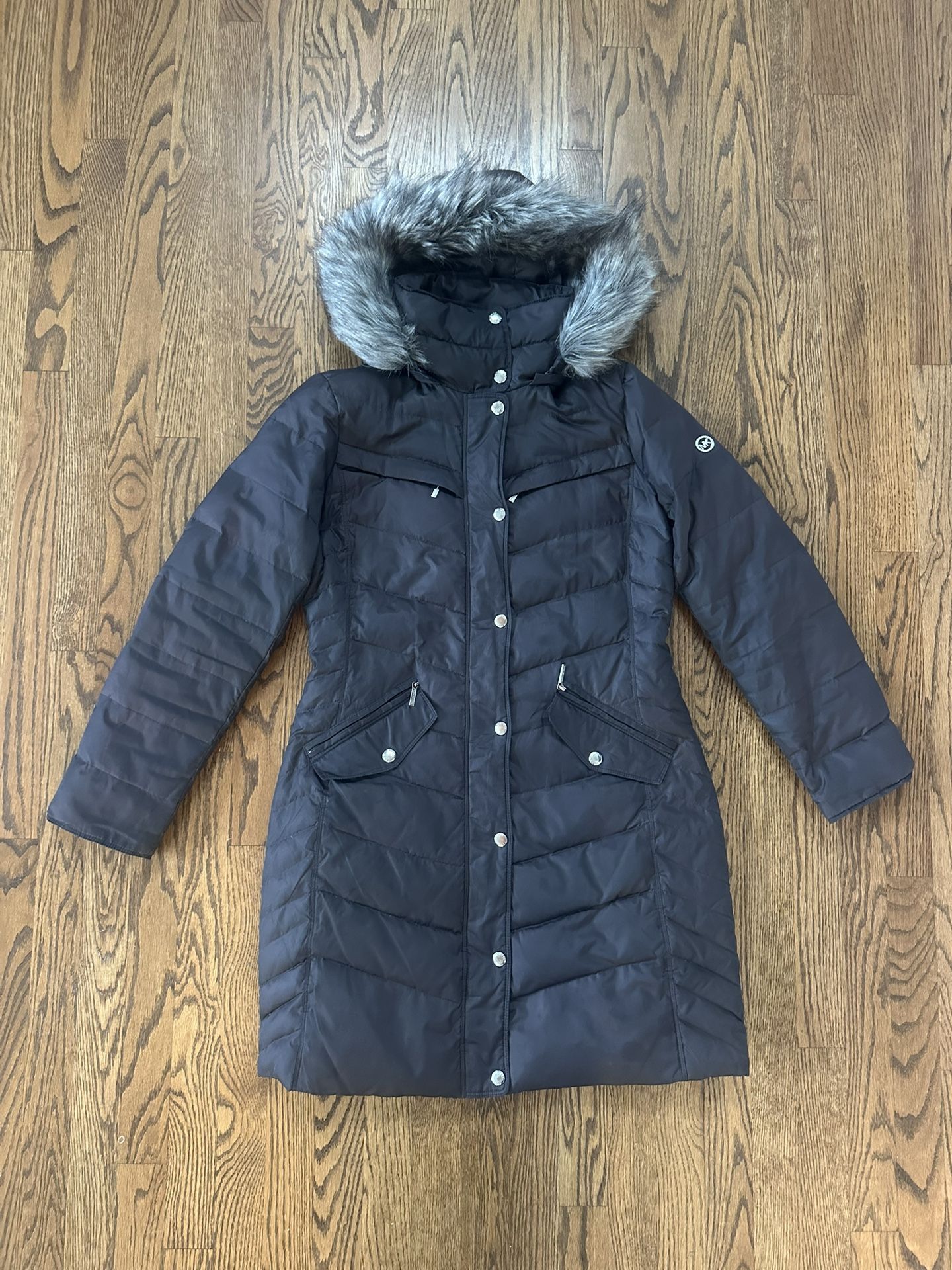 Look cute while being warm! Michael Kors brand Size small women’s. Longer length. Measurements are posted in the pictures. Dark grey color with silver hardware. Faux fur hood. Hood can be zippered off. 50% down (material/care tag is posted in the pictures). Good to very good condition but overall. The silver hardware has some tarnish. Smoke and pet free home. Pick up near the Burr Ridge Mall (I-55 and County Line Road) or WILL SHIP. I’m happy to bundle shipping if you want multiple listings. Just message me. Fast shipping! Tags: Nordstrom Ugg Aritzia Calvin Klein