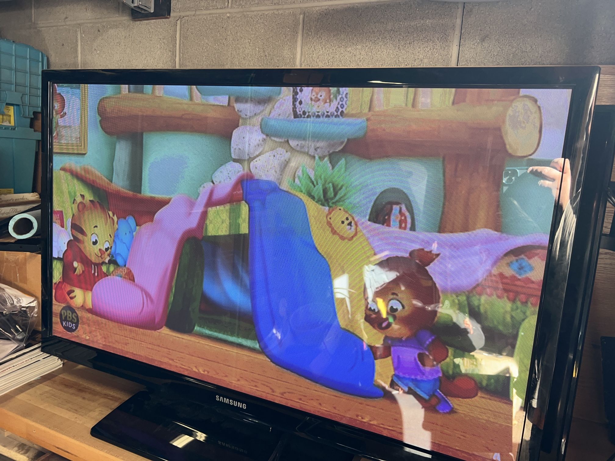 43" Samsung Plasma. Older TV but works good. Does have a scratch on the screen that you can't really see when it is on unless the screen is dark or when it's off. Would be a good garage or kids TV. Not a smart TV. Nothing fancy. Comes with the remote.