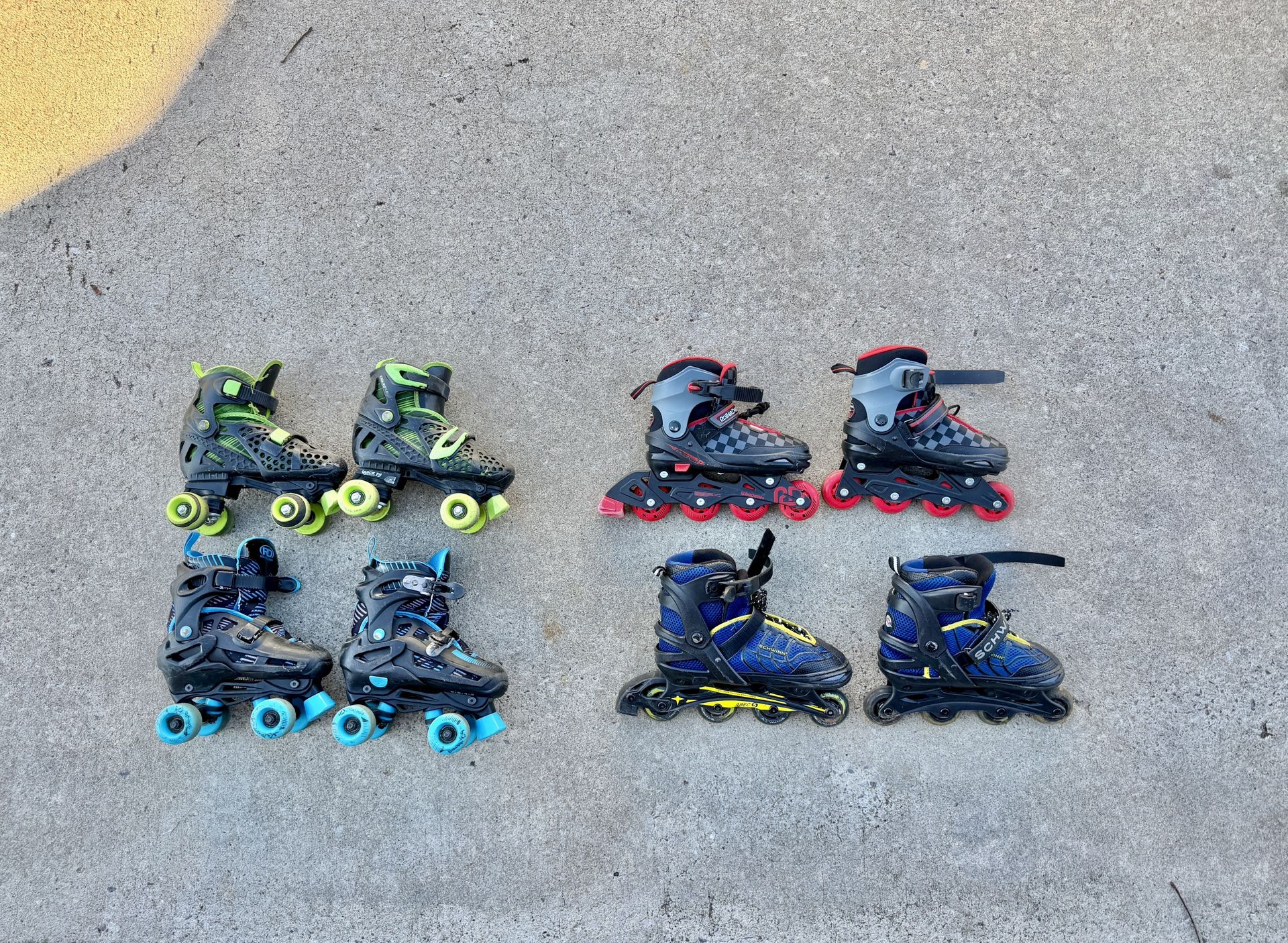 4 pairs of roller skates. Green, Baby Blue and red are expandable sizes 3-6. Just press the button to extend or shorten the length. Dark blue are expandable sizes 5-8. Pick up is in West Yukon, Se Habla Español