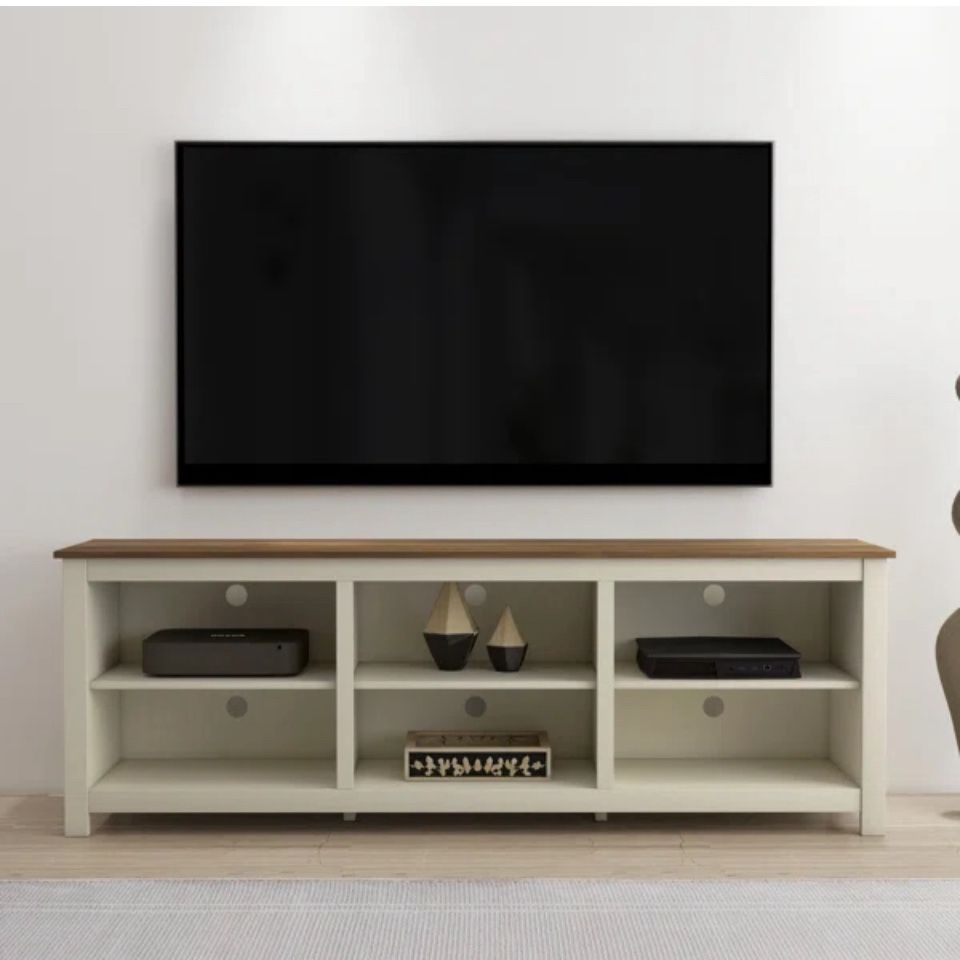 New TV Stand for TV’s up to 70” and 24” Tall High quality engineered wood Color Beige with natural wood top Fully assembled (US$80-$200 value) TV in picture is 50” (not included) Also available in black Cable holes in back 6 storage Cubes