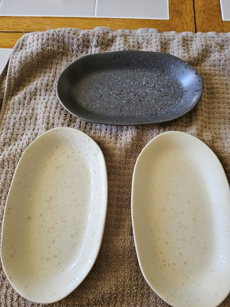 Set of 3 Appetizer plates Two Tan and One Black color plates Second hand but basically seems like never been used. ( WILL BE WASHED, AND DESINFECTED BEFORE SALE ) *- Check my other Listings if you're interested in more items, dishware, etc. -*