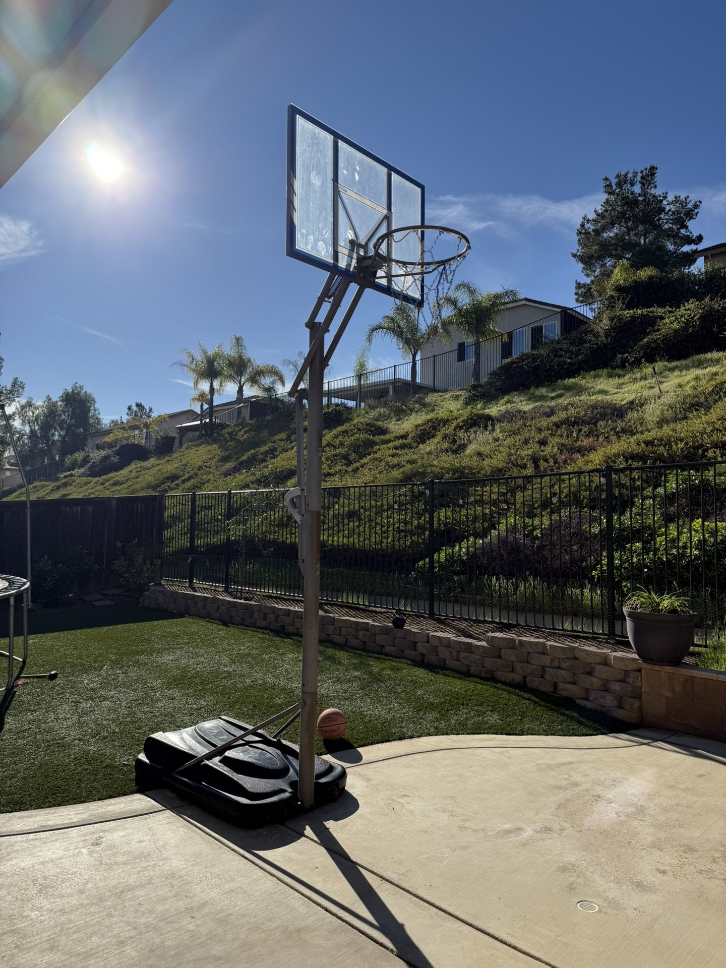Basketball hoop. Metal frame. Chain net. Good condition. Missing cap for the tank.