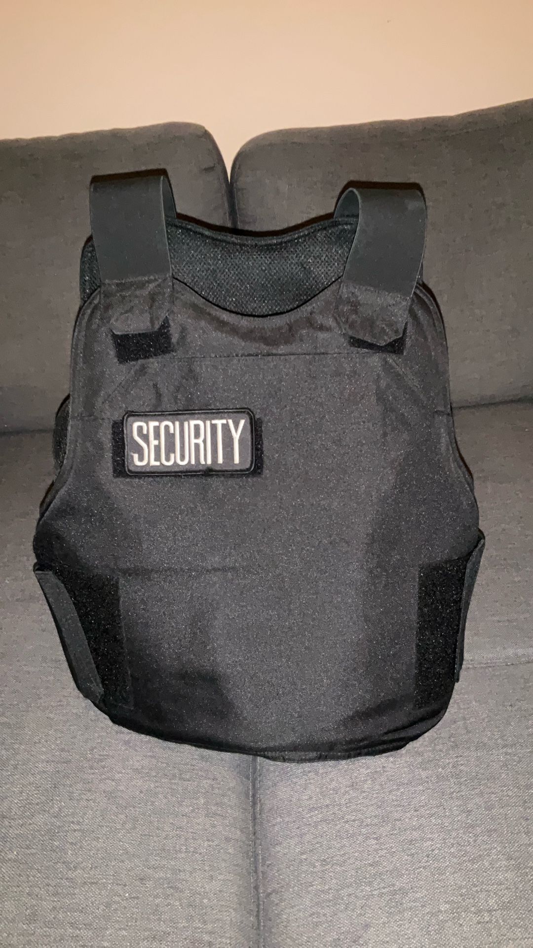 Will stop most handguns up to 45 caliber level three soft armor plates only worn a few times good for security and civilian can be worn over or under clothing adjustable Velcro