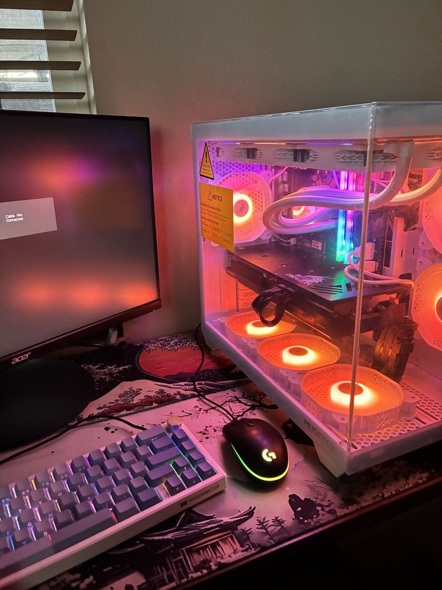 Ryzen 5 5800g and rx 6900 xt 16 gb. 32 gigs of ram. Max graphics in a high graphics game is 272-300 FPS.6 fans +3 fan AIO watercooling, mid tower aquarium case. 1 terabytes SSD and 2 terabyte hard-drive.Hardly used mint condition new case.Plastic case wrap still on. Comes with lightly used 180 hertz monitor along with lightly used custom light up soft key keyboard with volume knob. Comes with custom mousepad and Logitech mouse. This PC is an absolute beast and Is designed to withstand heavy graphic demanding games with constant FPS reliability. Plenty of storage and room to run programs and download games. I used this PC during amateur pro league tournaments and have never had issues. I’m having to sell it because of a recent lifestyle shift. P.S I’m willing to sell the monitor separately./