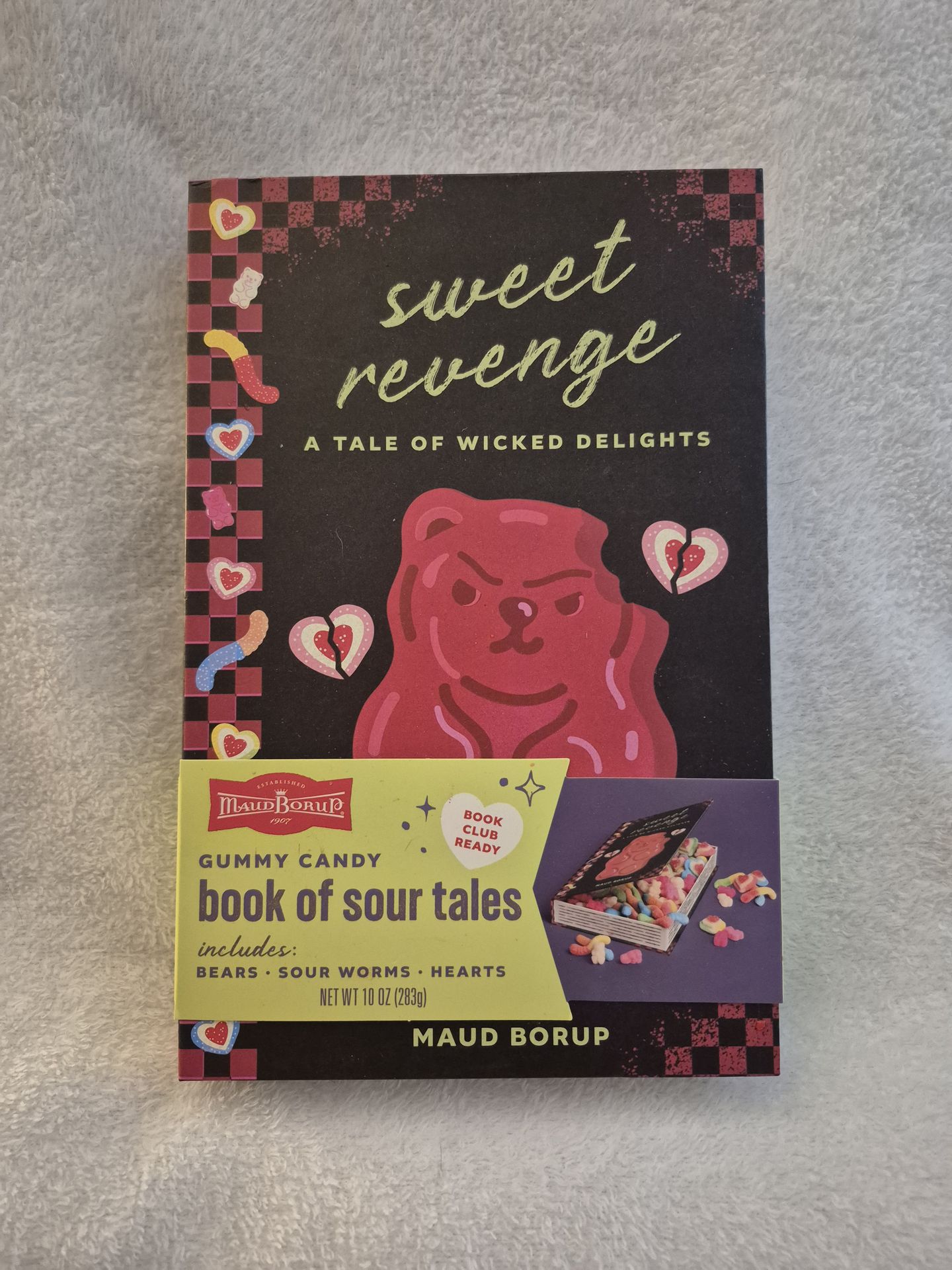 Indulge in a "decadent obsession" with this brilliantly packaged gummy candy set from Maud Borup. Designed to look like a classic thriller novel, the "Sweet Revenge" book opens to reveal a 10 oz collection of sour treats. Perfect for book lovers with a sweet tooth or as a unique gift for your next book club gathering. Features: Novelty Packaging: High-quality "book" box with a dark, whimsical aesthetic. Variety of Treats: Includes sour gummy bears, sour worms, and triple heart gummies. Ready to Gift: Features a "Book Club Ready" seal on the cover. Dietary Info: 100 calories per serving; see photos for full nutrition and ingredient list. Size: Net Weight 10 oz (283g). Condition: New (In Original Packaging)