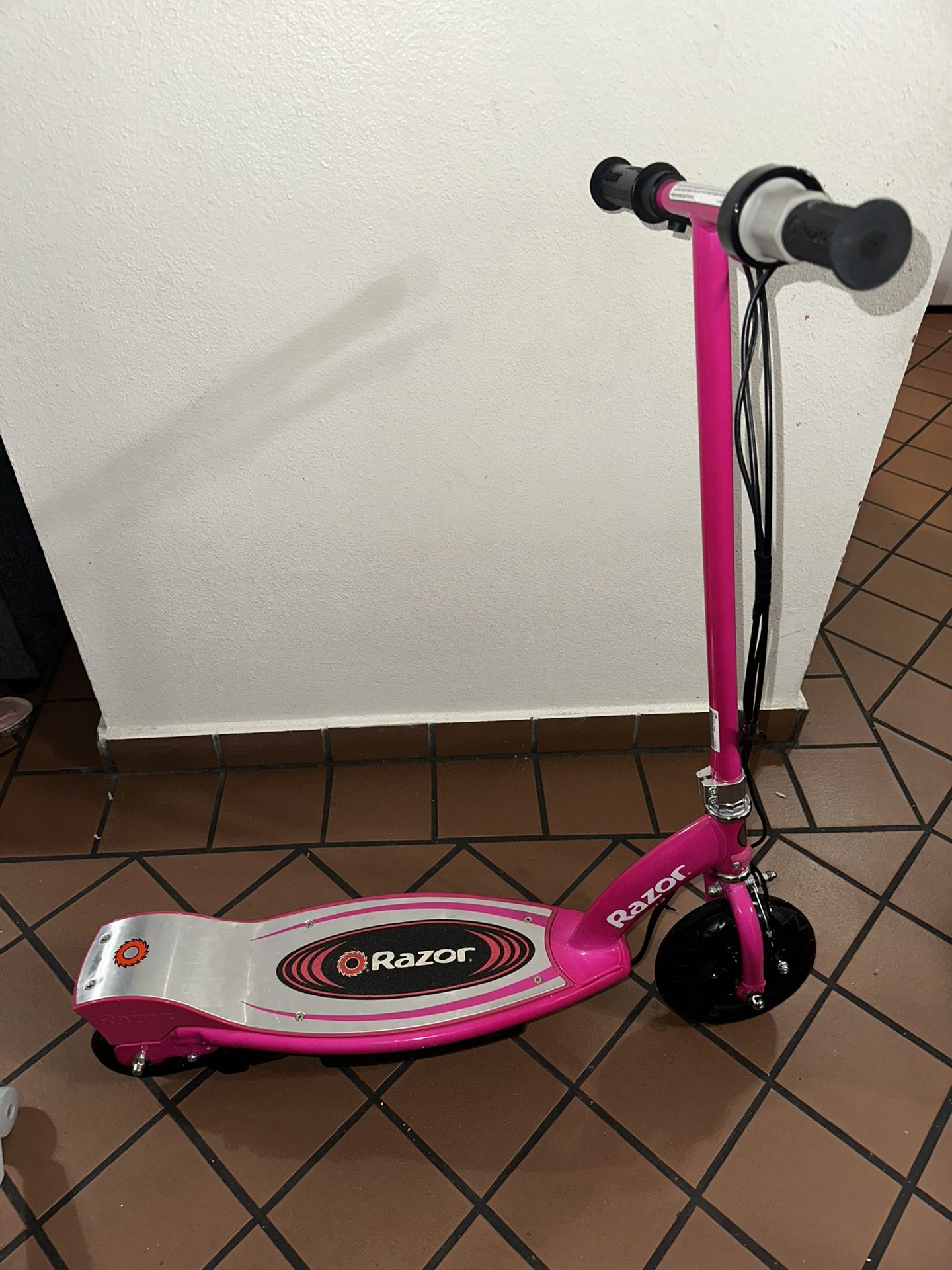 Selling a Razor E100 electric scooter, pink color. Great for kids/teens, fun and easy to ride. ✅ Brand: Razor ✅ Model: E100 ✅ Electric scooter ✅ Pink color ✅ Good overall condition (see photos) $100 Vendo scooter eléctrico Razor E100, color rosa. Ideal para niños/jóvenes, muy divertido y fácil de usar. ✅ Marca: Razor ✅ Modelo: E100 ✅ Eléctrico ✅ Color rosa ✅ Buen estado general (ver fotos) $100