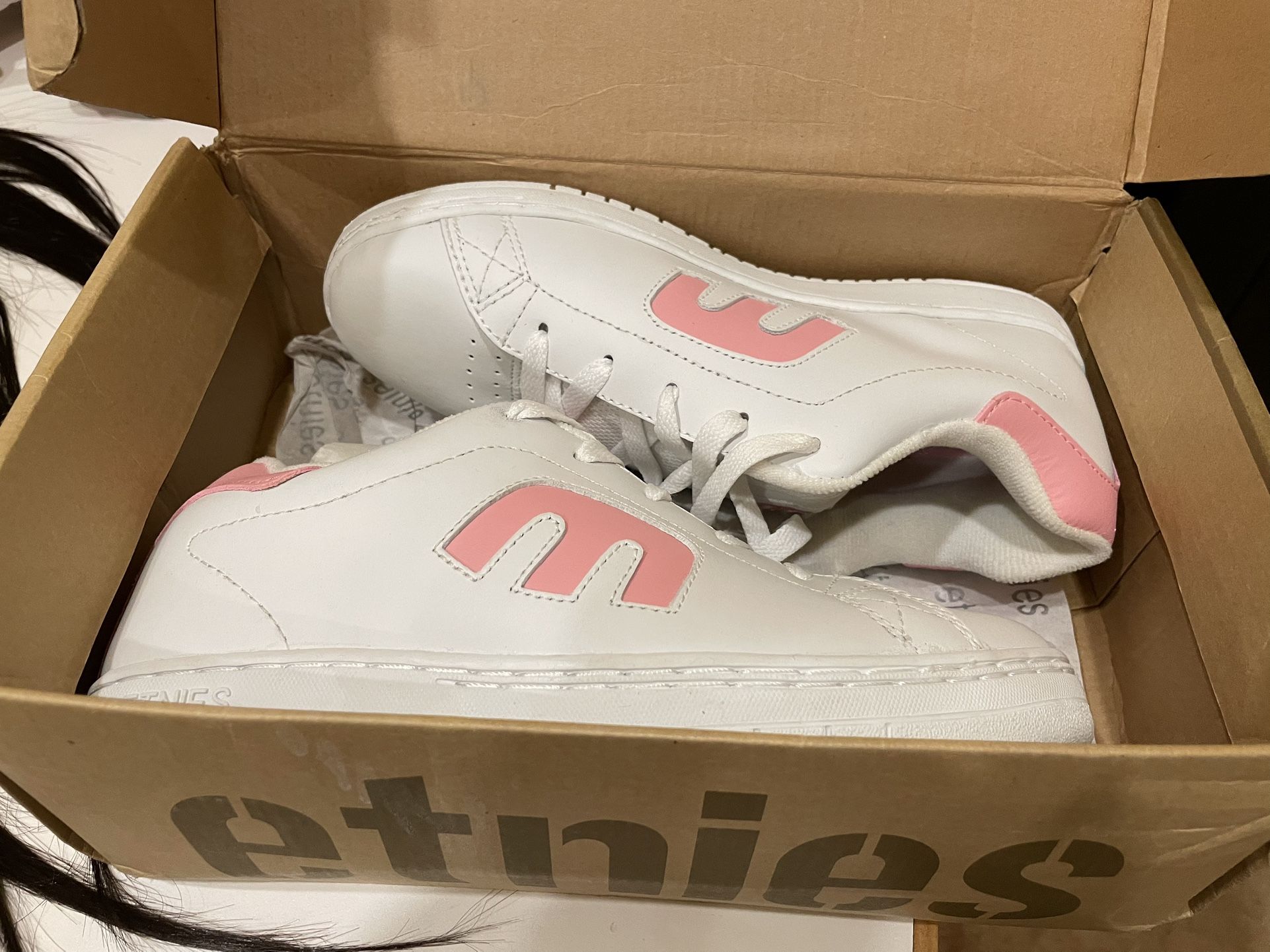 In original box in perfect condition, never worn brand new… size 6 white with pink accents vintage ETNIES ..