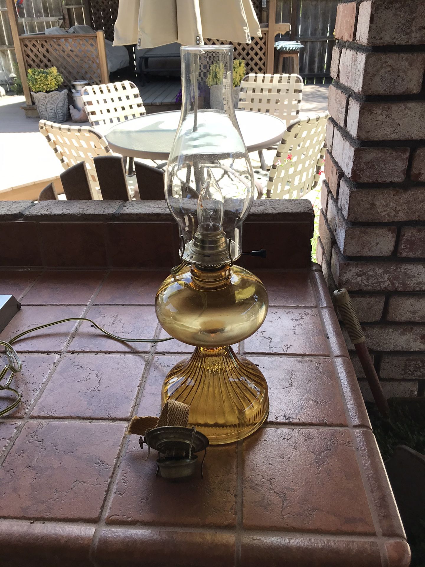18” tall amber lantern . Has been changed to electric but has original wick mechanism so it can be put back to oil. Make offer