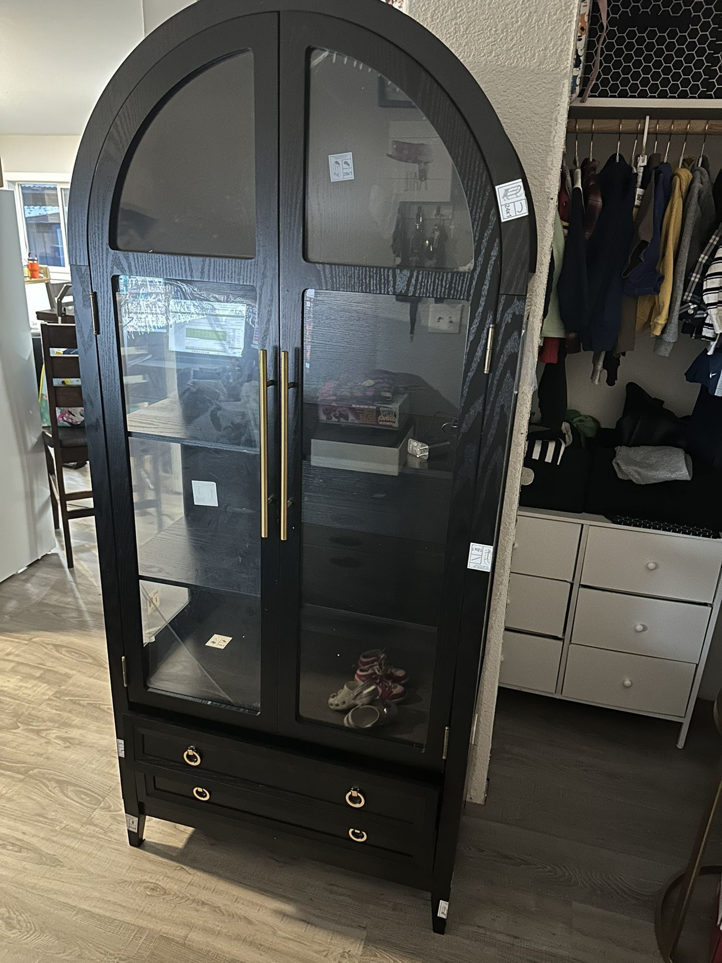 71" Arched Cabinet with Glass Doors, 4-Shelves Tall Display Cabinet and 2 Drawers, LED Display Case with 20 Lights for Collectibles/Book/Medal/Figure, Black Brand new- not used I think it’s bit defective but unsure if I assembled wrong. Plus no longer needed- As is