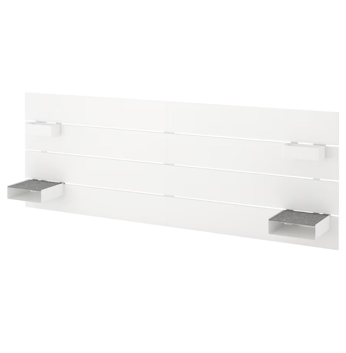 White IKEA wall-mounted headboard. Please see photos for the measurements. Also…Please note that the headboard does not come with the trays included.