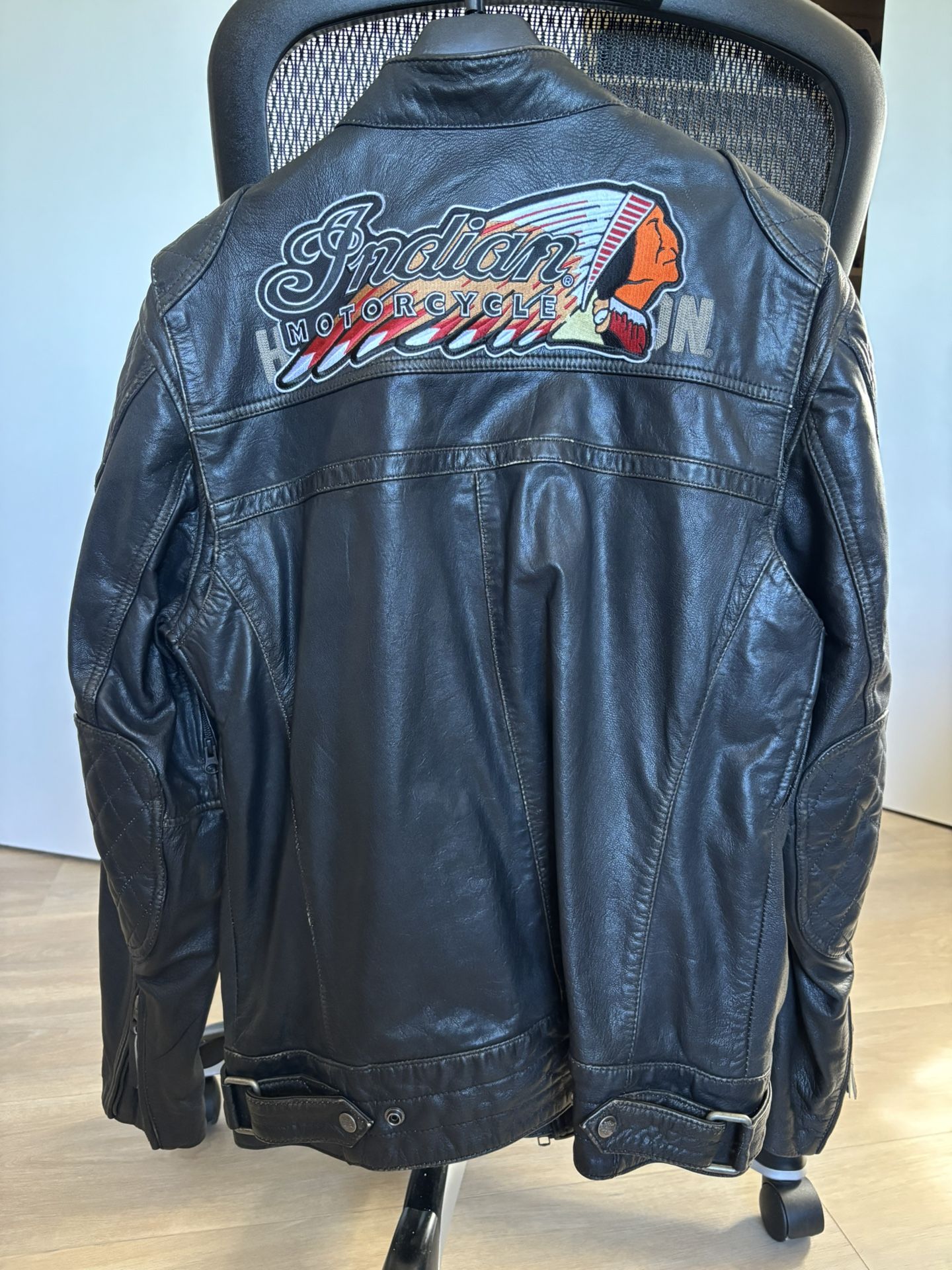 Like new. Very clean leather jacket. Originally bought it at Harley Davison store. Put Indian patch when I switched bikes. Size is M but fits L size.
