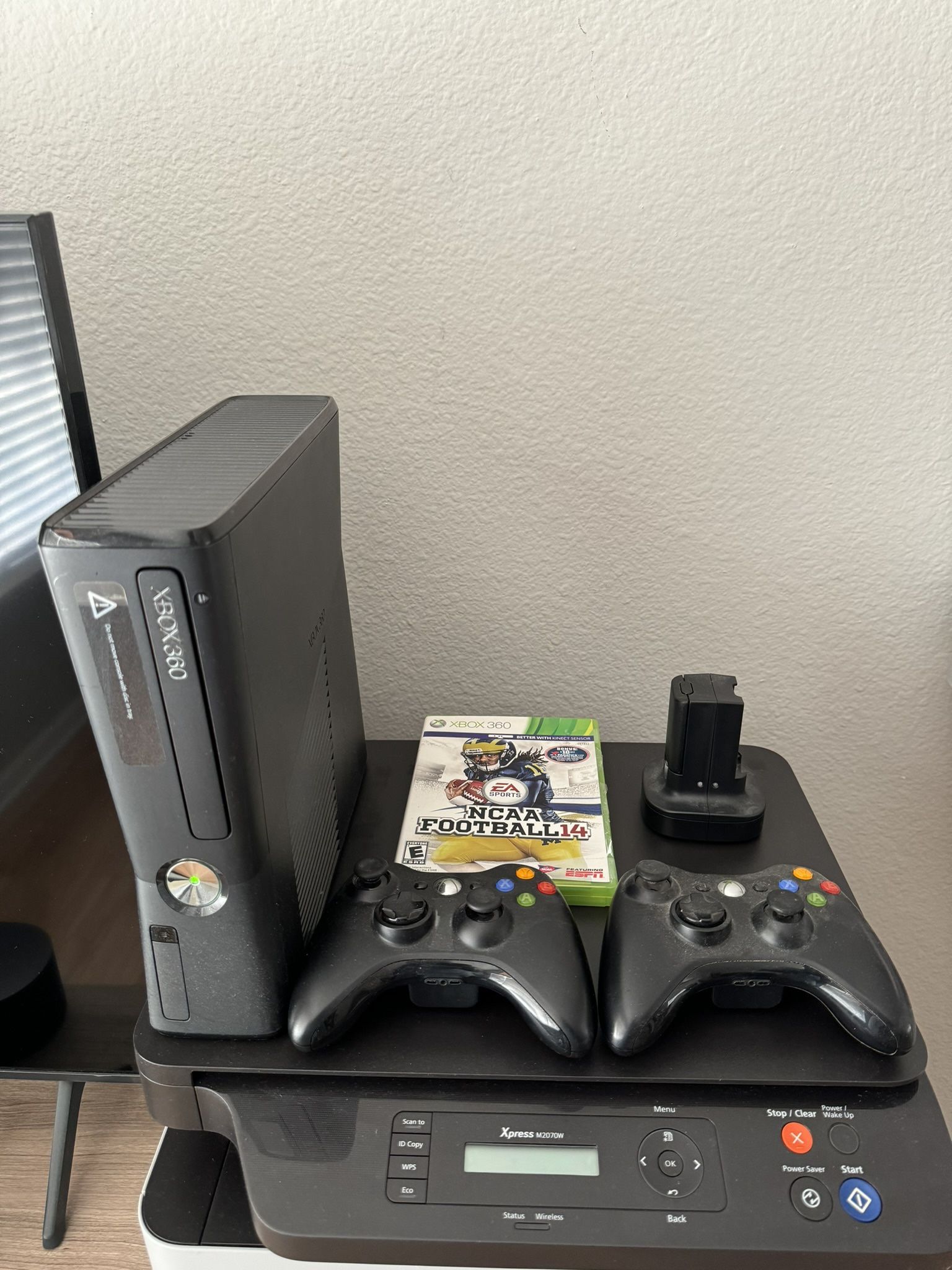 Xbox 360 console, NCAA 14 video game, both are in excellent condition, two controllers, rechargeable battery kit.