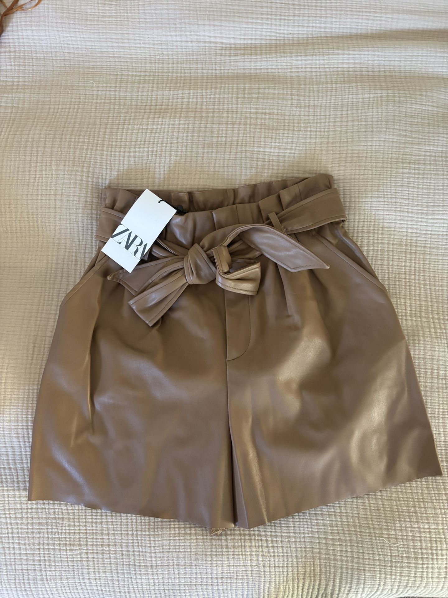 ZARA Faux Leather Shorts – Size M High-waisted paperbag style with tie belt and side pockets. Camel color, brand new with tags.