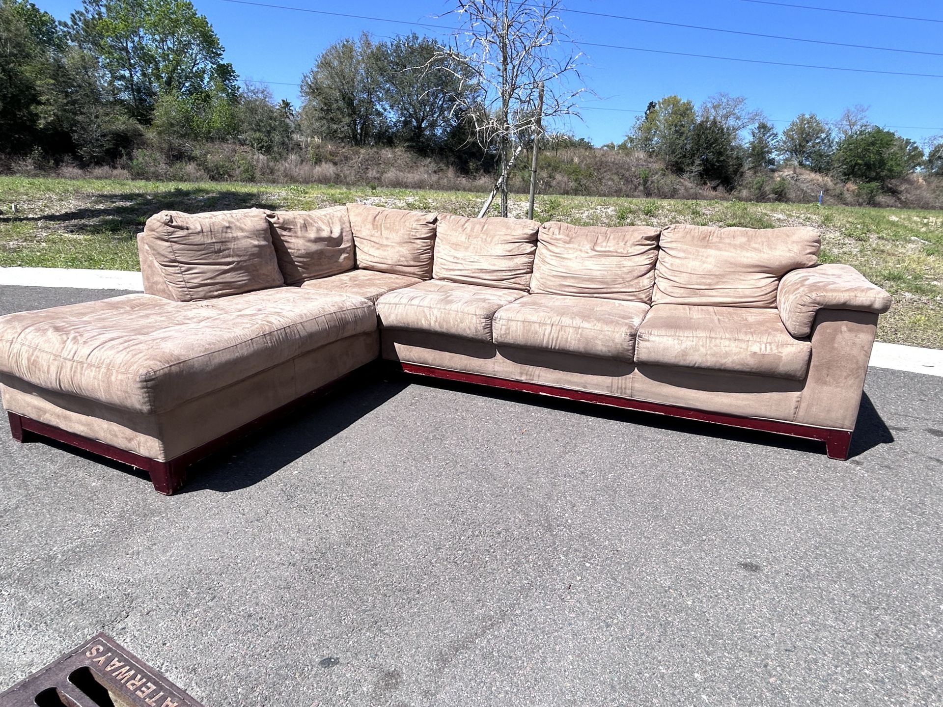 Spacious L-shaped sectional couch in a soft neutral tan color—perfect for any living room setup! Super comfortable with deep seating and great for lounging or entertaining. ✨ Details: • Large chaise on one side (great for stretching out) • Soft microfiber/suede-like fabric • Solid wood base with a modern look • Cushions are plush and supportive Can deliver pay after delivery