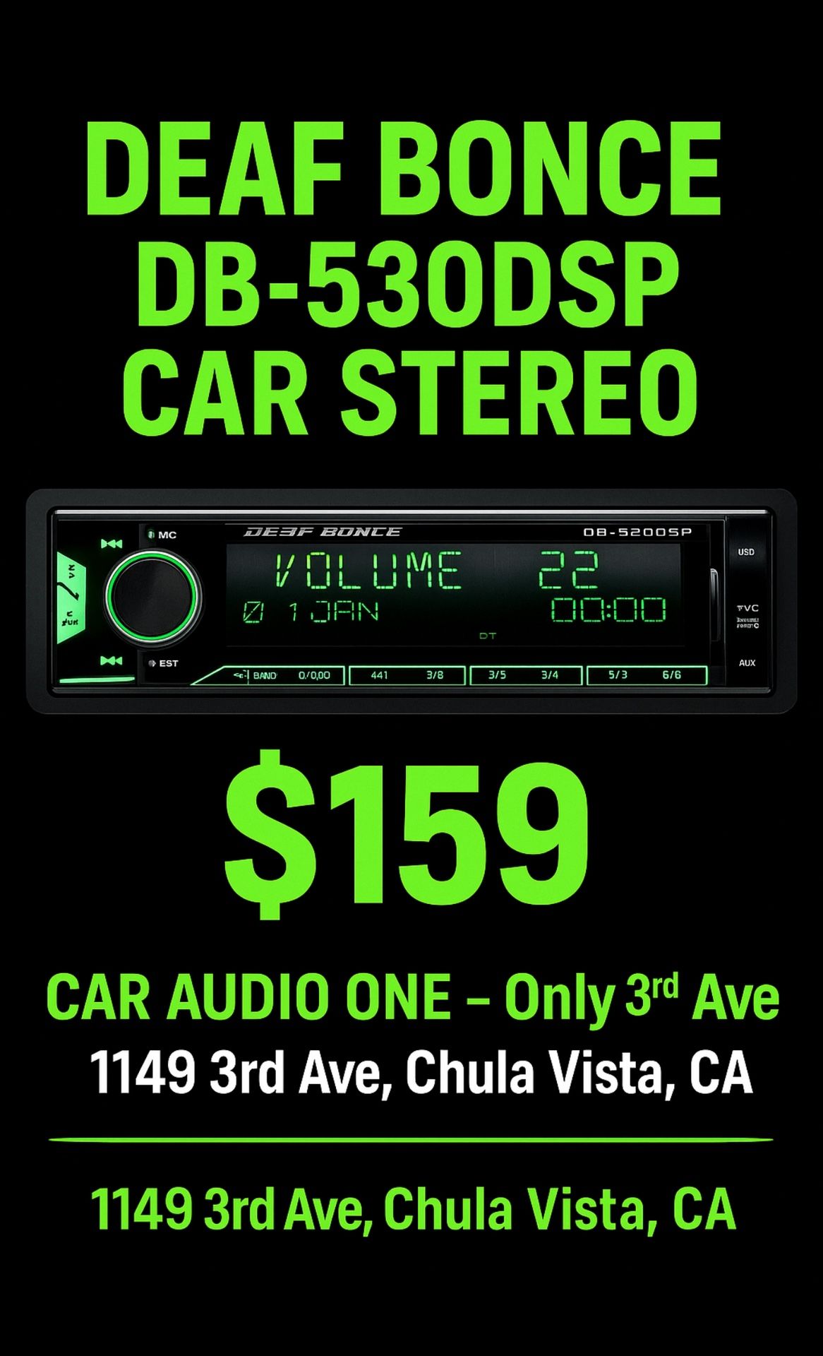 Deaf Bonce DB-530DSP Car Stereo Head Unit – 8 RCA Outputs, DSP, Mobile App Control CAR AUDIO ONE Deals -THIRD AVE 1149 Third Ave, Chula Vista, CA 91911 Car Audio ONE-3RD Car Stereo • Audio • Motorsports • Lighting • Alarms • Tint & More Find everything you need for your ride — top brands, great deals, and professional installation! Call us: 619-651-7371 📍Visit us: 1149 Third Ave, Chula Vista, CA 91911 We are open 9-7