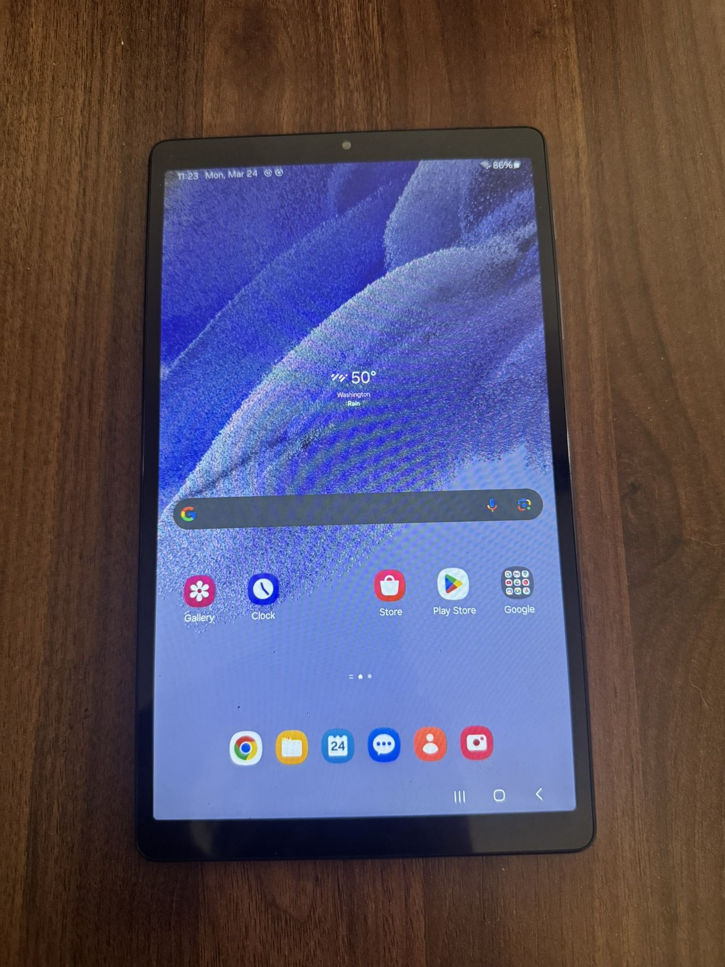 32 GB storage. Works fine!Tthe newest android version is a little slow on it but would be perfect as a youtube tablet for a kid, or as a reading tablet. uses usb-c to charge. I can throw in a USBC cable but not the power brick.