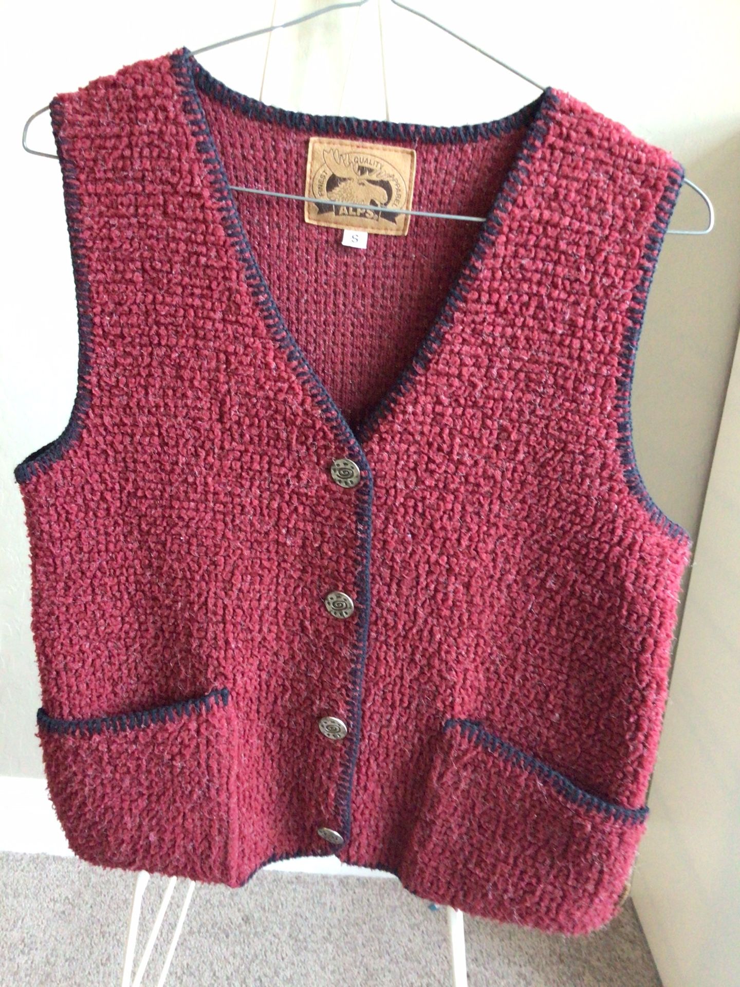 From REI, ladies red/burgundy with black trim, front pocket, button through, sleeveless vest. Size small, soft fleece fabric - $10 cash only. Excellent condition. No pets, smoke free home.