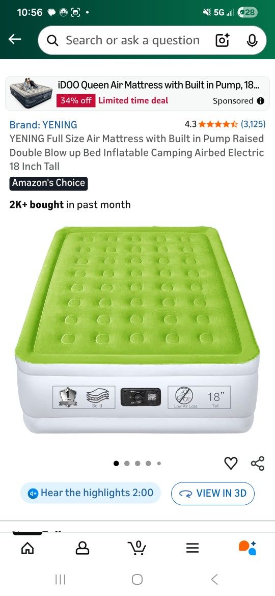 18 in tall full size double layer air mattress with built in pump for camping, house, travel