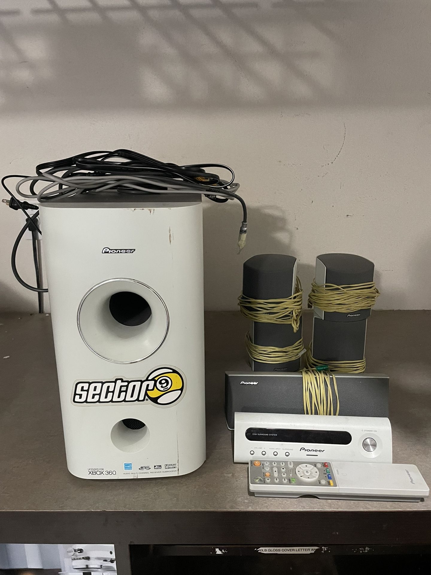 Surround sound by Pioneer, 5 speakers, subwoofer, comes with remote and works with Xbox 360 (that’s what I used it with), but should work with many other gaming consoles.