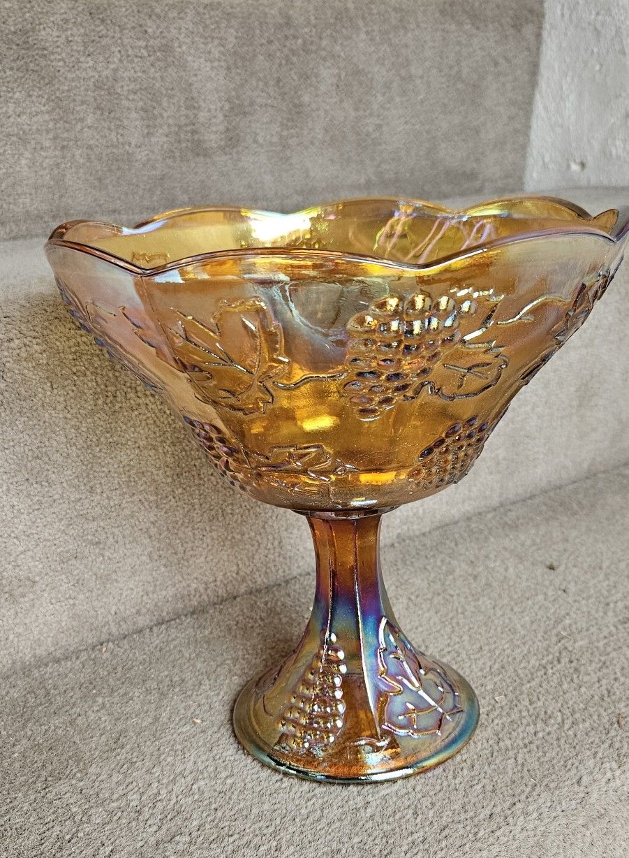 Amber Carnival Glass Iridescent Harvest Gold Grapes/Leaves Harvest pattern (embossed grapes and leaves) Carnival glass - iridescent gold color 8 1/2" tall, 8 1/4" top diameter Weighs 2 lbs. 14.8 oz. Great pre-owned condition - no chips or cracks Indiana Glass Harvest (Grape & Leaf) Gold Carnival Glass Fruit/Compote Bowl 1970