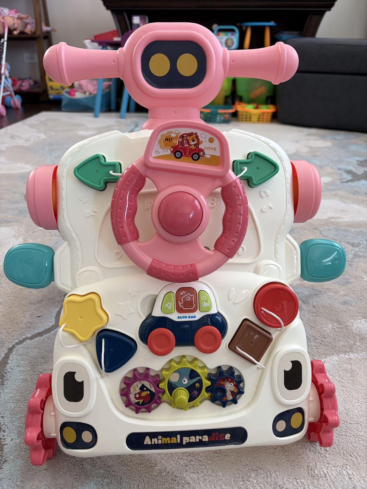 Available in Joliet area too. The KOPPOP 3 in 1 Baby Walker and Activity Center in pink is an engaging early educational push toy designed for infants and toddlers aged 12 months and up, supporting their journey from sitting to standing and learning to walk. This versatile walker features a detachable activity panel equipped with a turning cube, shape recognition block, colorful gear, small beads, a basketball frame, and an elephant-shaped electronic piano, all designed to enhance hand-eye coordination and brain development. Built with a stable triangle structure and a water tank for increased stability, it also includes anti-slip wheels with adjustable speed settings to prevent O-legs. Crafted from safe, non-toxic ABS material with smooth edges, this walker promotes balance, coordination, and leg strength. Features a 3-in-1 design, functioning as a baby push walker, an entertainment table, and a hangable activity center. Designed to support babies in learning to walk and transitioning from sitting to standing. Includes an early educational music panel for engaging play. Suitable for infants and toddlers aged 12 months and older. Aids in developing the baby’s coordination and leg strength. Promotes overall brain development. Equipped with a removable activity panel that includes a turning cube, shape recognition block, colorful turnable gear, small beads, basketball frame, and an elephant-shaped electronic piano. Helps cultivate the baby's cognitive skills. Features a stable triangle support structure on the side and a four-point rectangular structure on the bottom to reduce the center of gravity. Designed to be resistant to rollovers for enhanced safety. Includes a water tank design, allowing for the addition of water or sand to increase the chassis weight for improved stability. Ensures smooth forward movement for the baby during use. Both wheels are equipped with anti-slip rings to increase friction with the ground. The rear wheel speed can be adjusted to standard or low settings. Accommodates the baby’s walking needs at various developmental stages. Aids in preventing bow legs. Constructed from safe, non-toxic ABS material. Designed with smooth edges and no burrs for child safety. Helps in exercising the baby’s balance ability. Cultivates imagination through interactive play. Enhances hand and brain coordination ability.