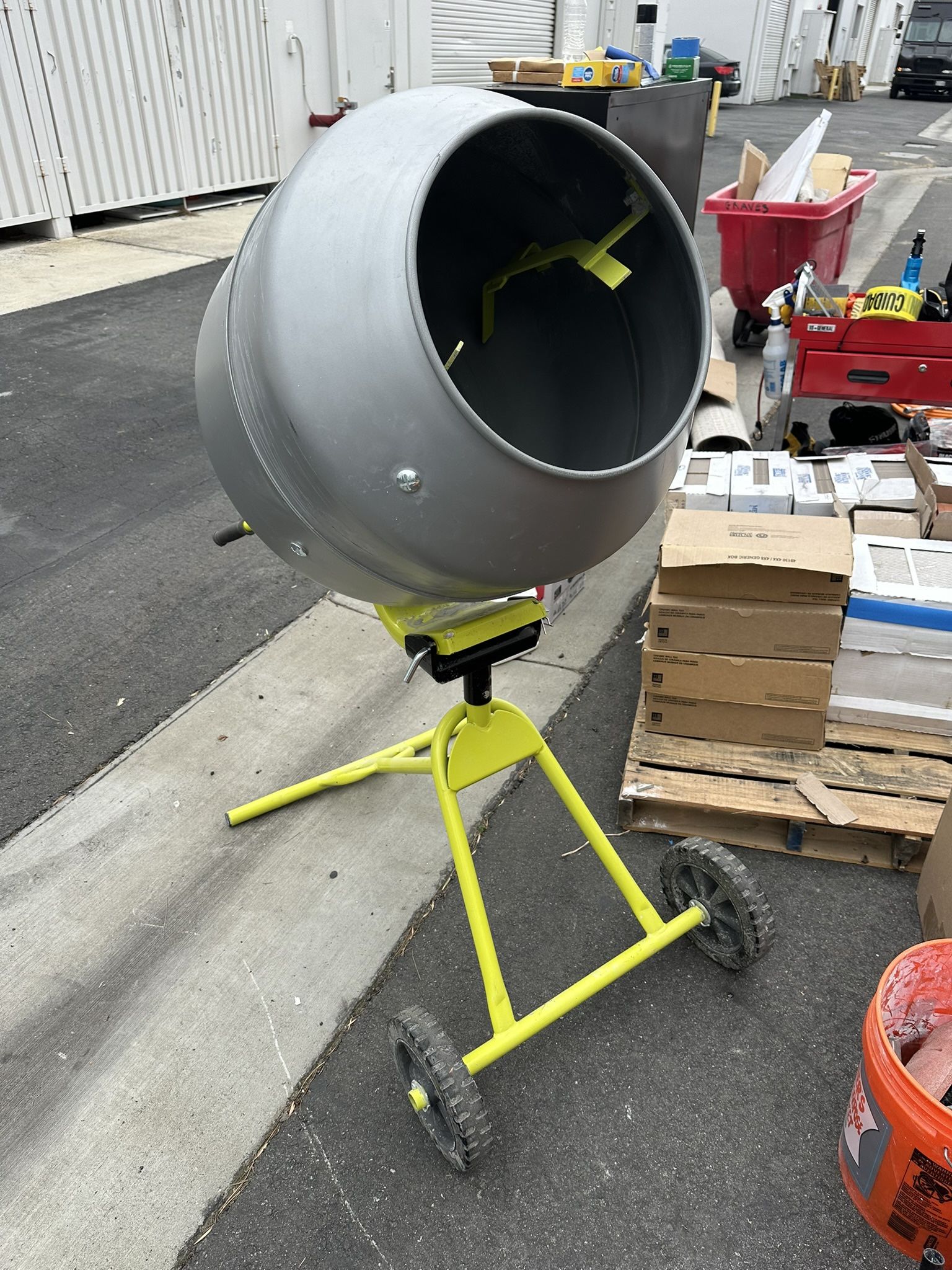 Brand New portable Ryobi concrete mixer. Holds 5 cubic feet of concrete Dimensions Assembled Depth (in.) 50.50 in Assembled Height (in.) 55 in Assembled Width (in.) 25.38 in Details Assembly Required Yes Power Type Electric Product Weight (lb.) 110 lb