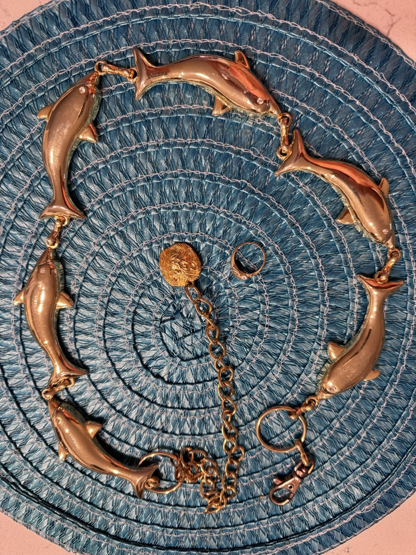 Ring size 4.5 gold with diamond eye . Belt size medium 6-8 womens waste gold dolphins