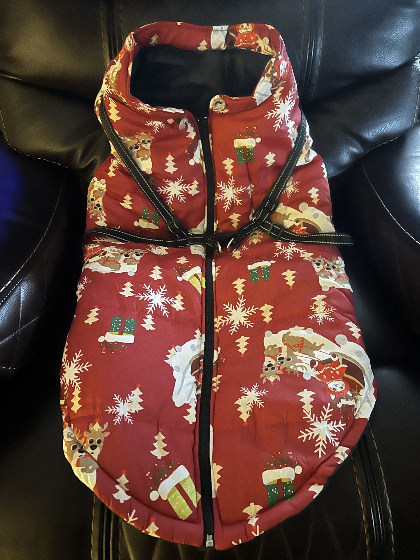 New / Nuevo Dog Jacket Windproof Dog Sweater with Padded Vest Chest Strap Harness Dogs Coat Christmas Red XL Neck 28 “ Chest 35 “