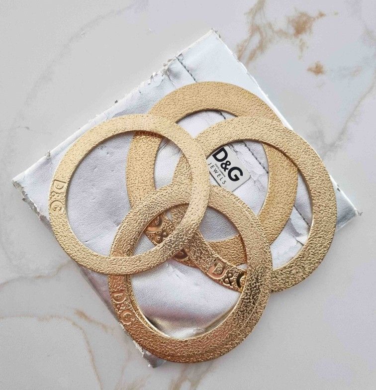 PRICE IS FIRM. Set of 5 Dolce & Gabbana brass bangles from the "Stone" collection; feature a unique hammered or "stardust" finish and engraved with the D&G logo. Material: Gold-plated brass The pouch has deteriorated over time, but the set of 5 bangles is in perfect condition. The original price was $385, plus tax, as shown in one photo. π Pick it up at PUBLIX 20425 Old Cutler Rd.Cutler Bay, Fl. 33189 π¦ I can ship them if you pay with Zelle.