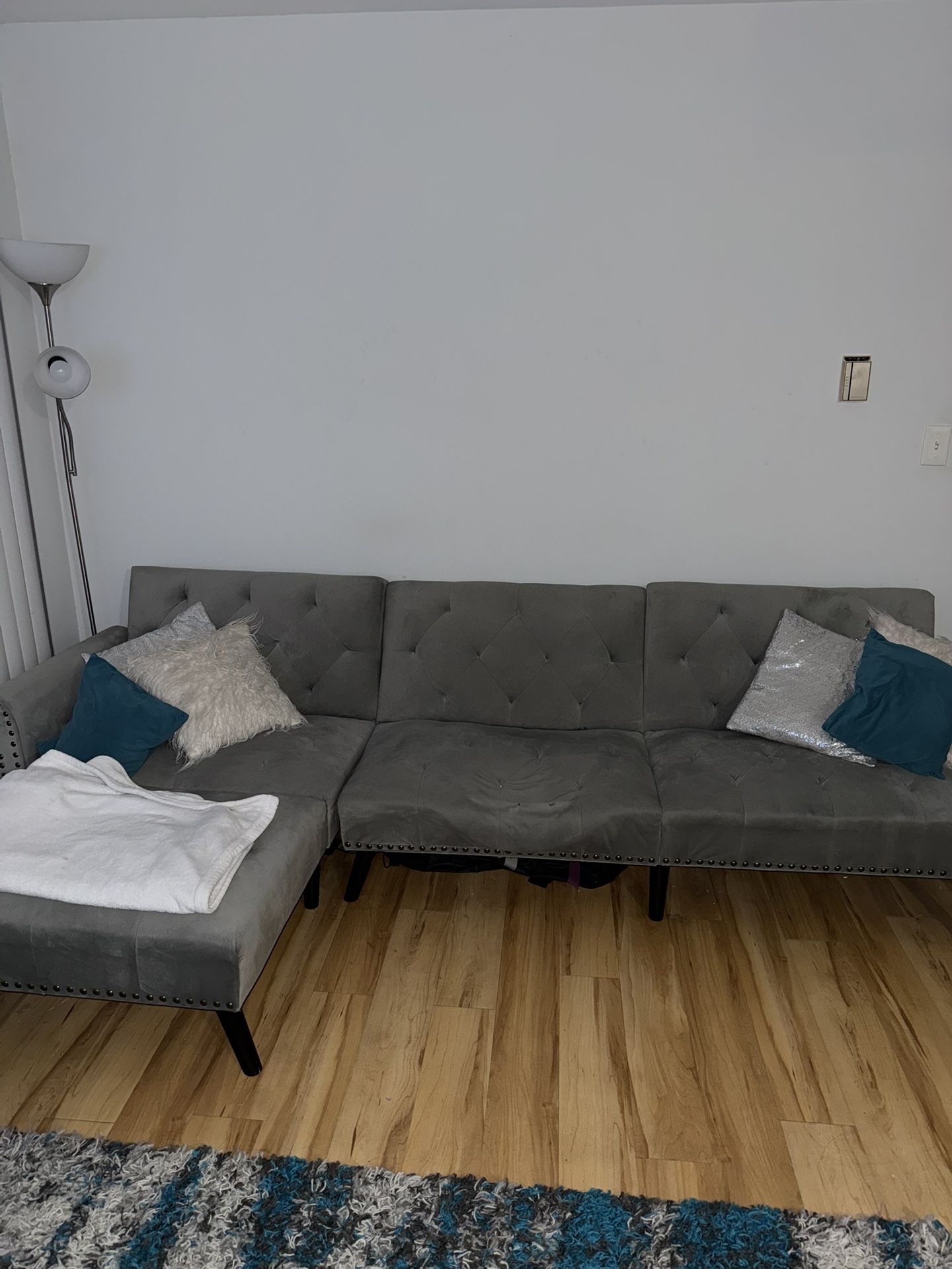 Gray sectional sofa with chaise. It also lays down as a futon. The couch is sturdy and functional, but has visible wear/damage from use (please see photos).