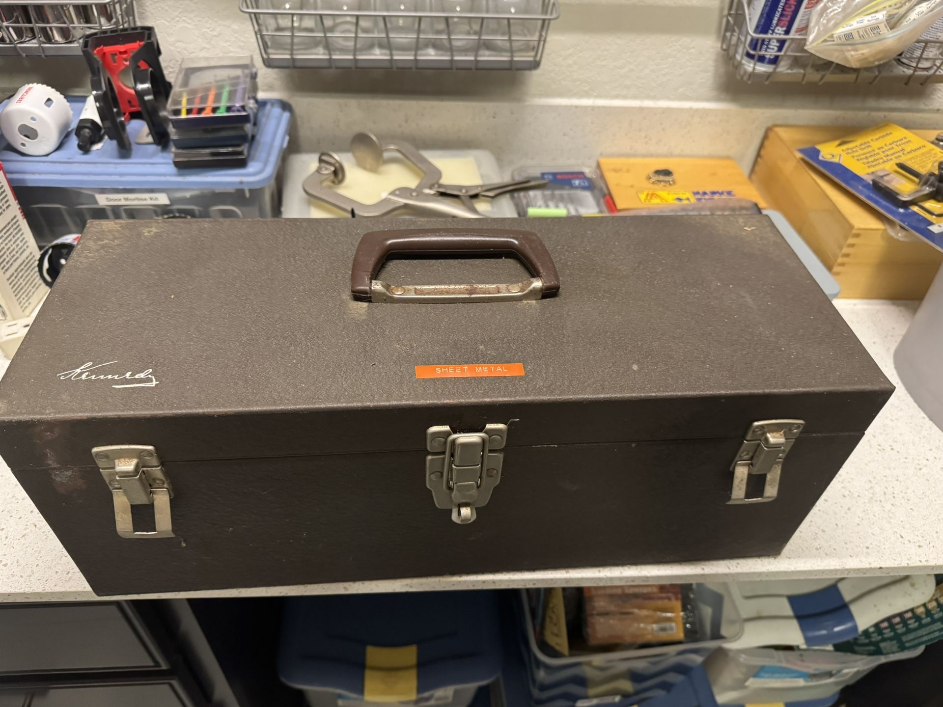 Various sheet metal tools. Left, right and center cutting, notching, edge benders, etc. In a Kennedy toolbox.