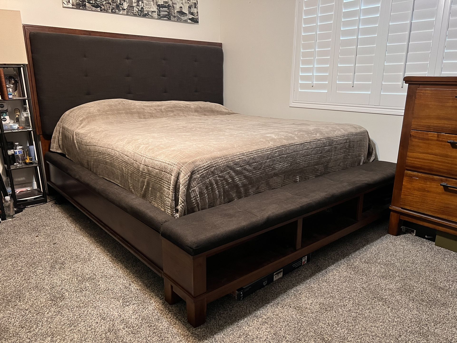 Cal king bed set in good condition! Comes with Dresser and night stand. Will also include L shaped desk and Shoe rack in good condition As well. I don’t have pics of those but they are in good condition.