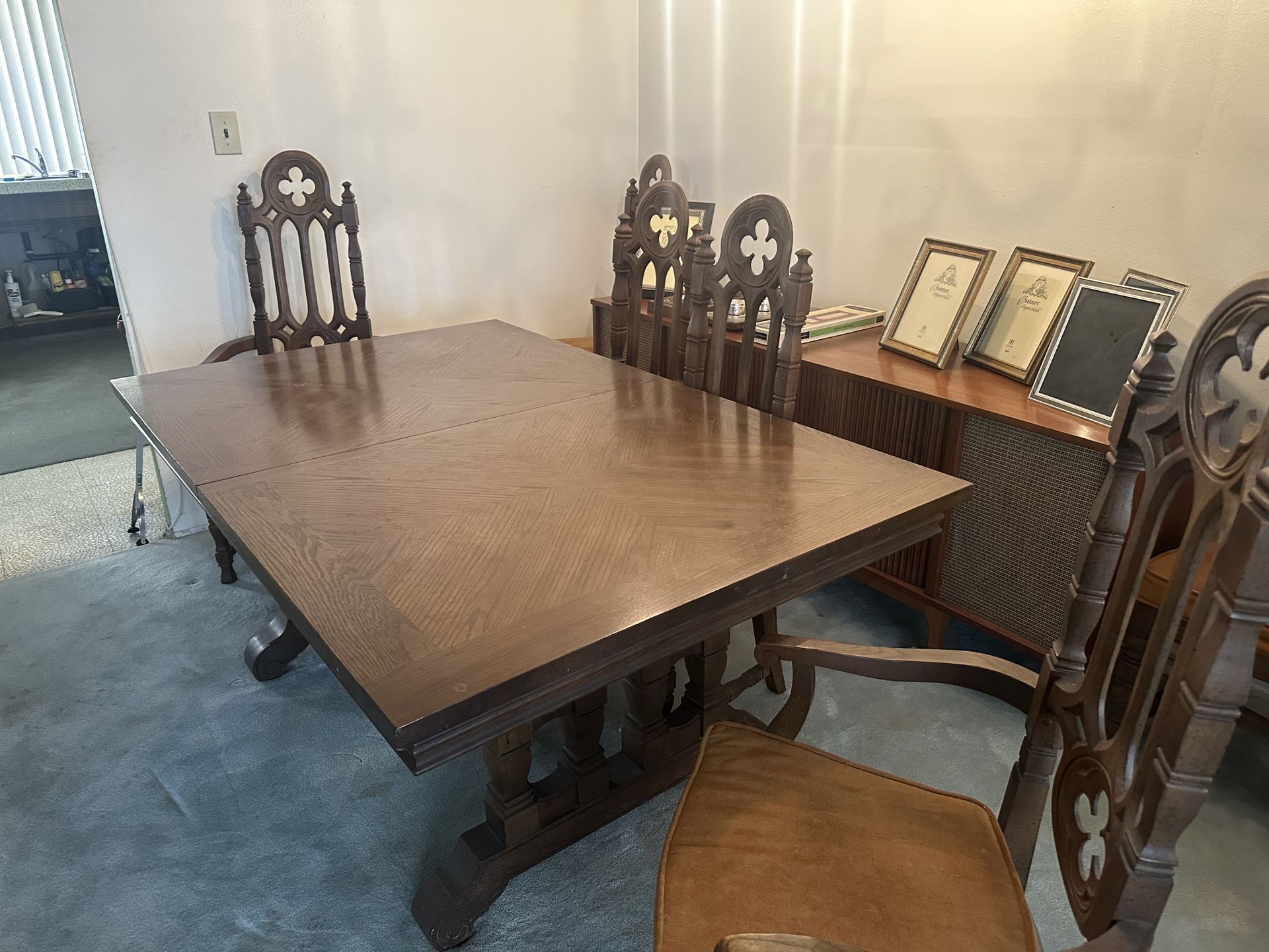This dining set is an antique Jacobean-style likely manufactured by Stanley Furniture. Chairs are very sturdy table is in good condition. Two arm chairs Two regular chairs Table with leaf