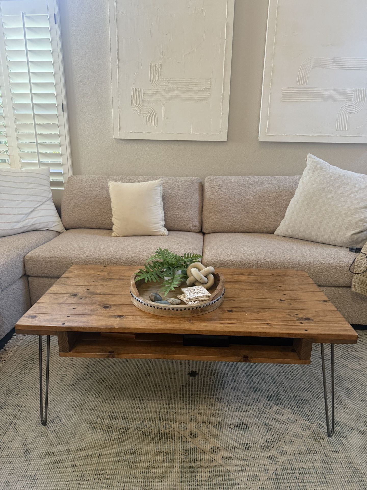 Beautiful handcrafted wood coffee table featuring a sleek, modern design with sturdy black hairpin legs and built-in storage! Perfect for living rooms, apartments, or studios — adds warmth, function, and style to any space. Details: • Custom built, one-of-a-kind piece • Solid wood tabletop (sealed and finished for durability) • Hidden storage compartment under the top (perfect for remotes, magazines, etc.) • hairpin legs for a modern touch
