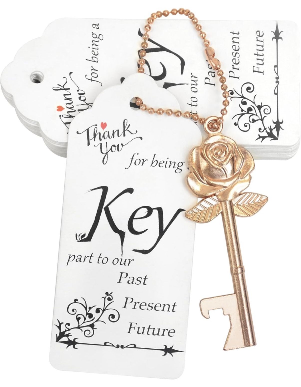 100 PCS Rose Flower Shaped Keys Wedding Favors Gift for Guest Bulk Skeleton Key Bottle Opener with Card and Chain for Rustic Party Bridal Showers Decorations (Rose Gold)