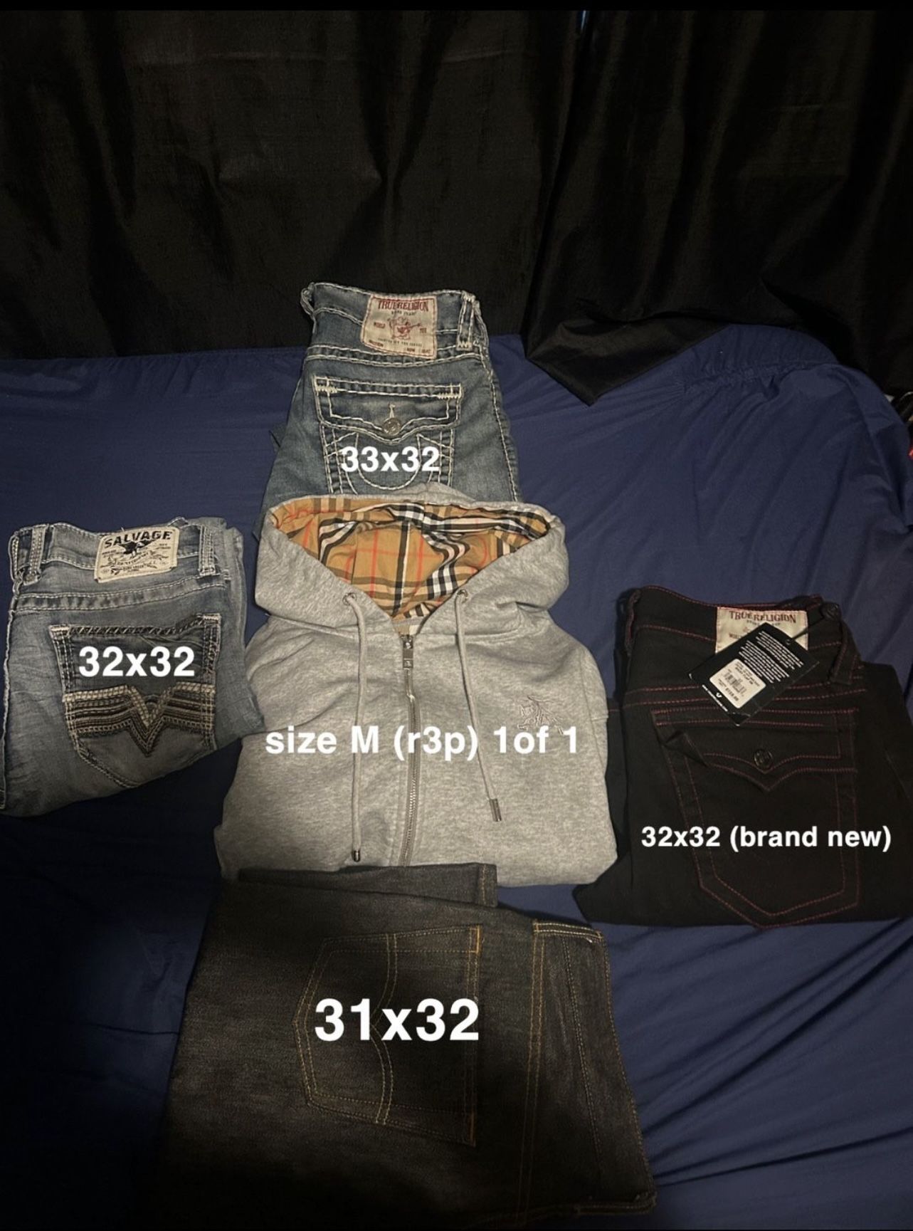 burberry 10f1 zip up $80 black and red true religion jeans (brand new)- $100/$80 blue and white true religion jeans-$60 salvage jeans-$50/$40/ charcoal grey 501s-$40/$20 or take everything for $190 (ALL PRICES NEGOTIABLE‼️‼️)