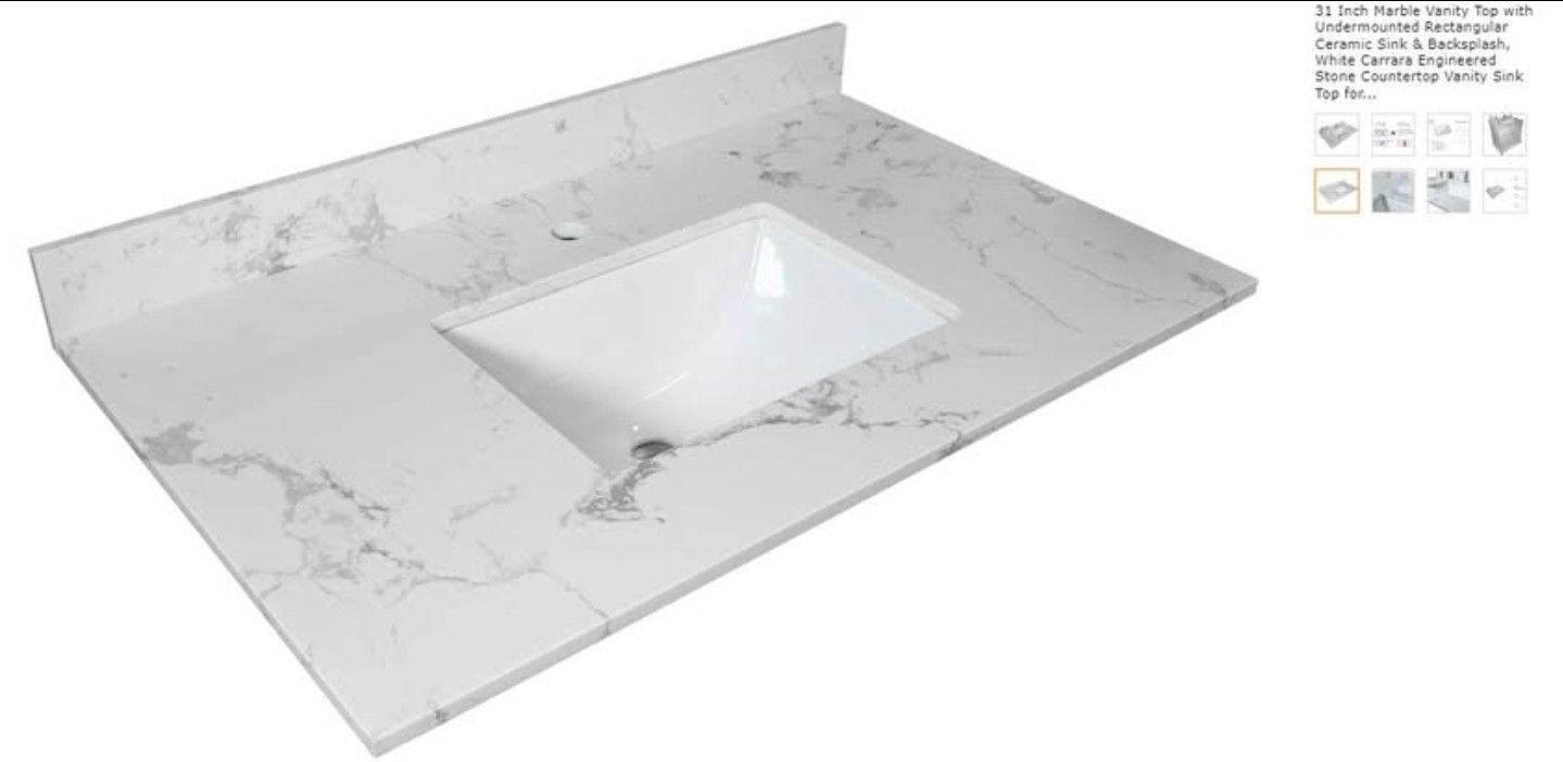 31 Inch Marble Vanity Top with Undermounted Rectangular Ceramic Sink & Backsplash, White Carrara Engineered Stone Countertop Vanity Sink Top for Bathroom 1 Pre-Drilled Hole - Still in original shipping box. - No Faucet included and PICK UP ONLY Brand MXJM Color 152-10.7SJ-23553 Material Ceramic, Marble, Stone Size 152-10.7SJ-23553 Product Dimensions- 22"D x 31"W x 4"H