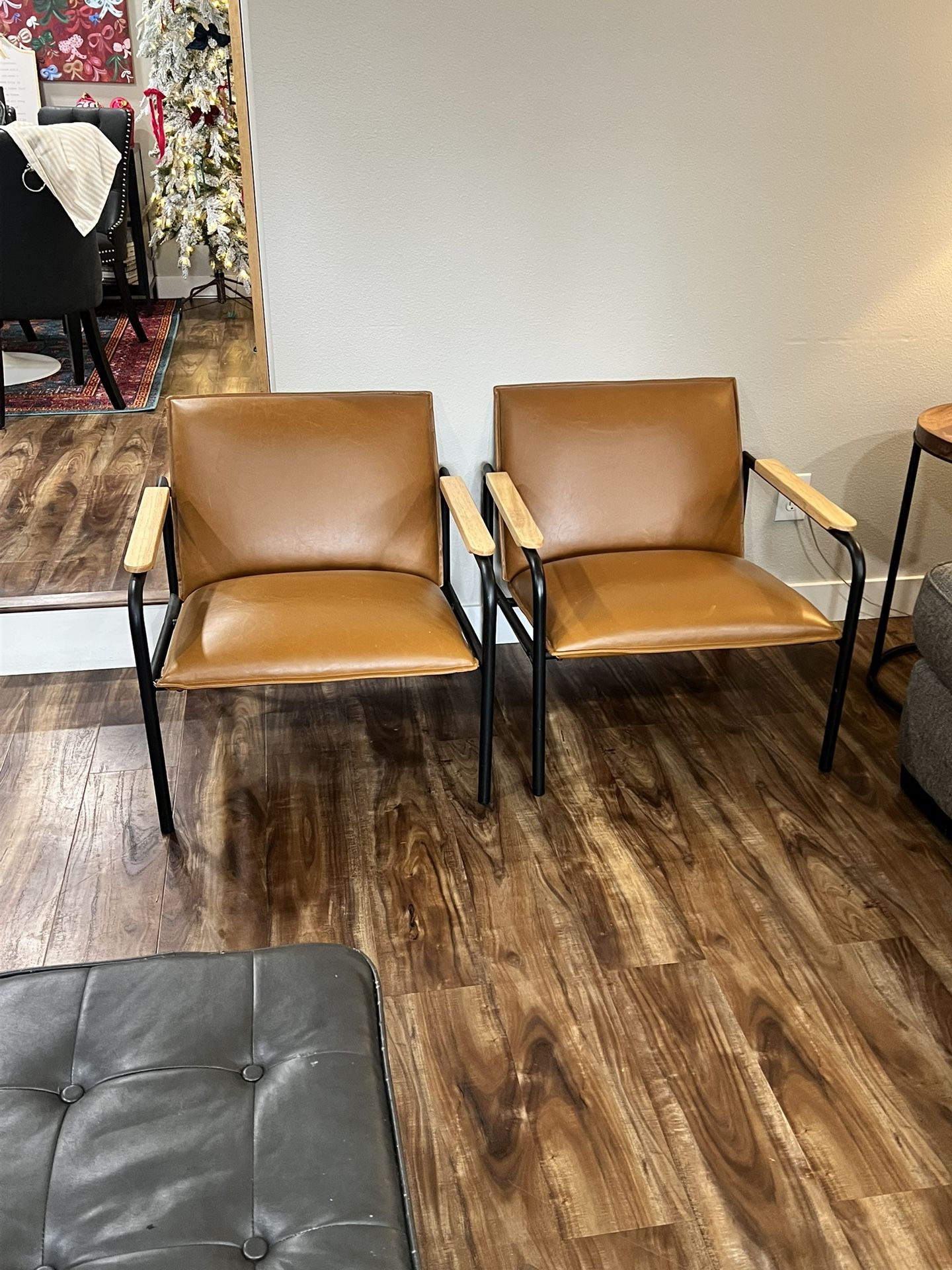 Pair of low profile tan faux leather arm chairs. 27’ tall and 26” wide