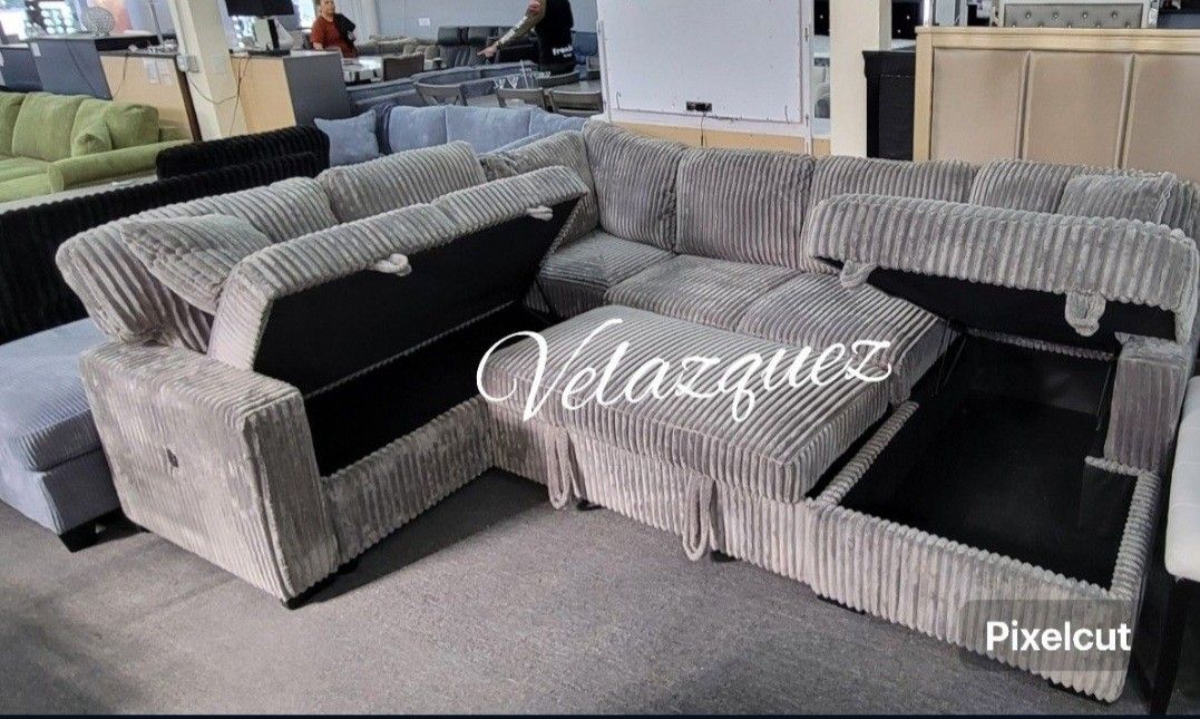 4 pc Smoke grey fur like corduroy fabric sectional sofa with storage chaise and love seat and pop up sleep area in center USB charging. Sectional features a pull out sleep area in center and storage in chaise and love seat, with USB charging on side . Sectional measures 120" x 92" x 60" L chaise x 36" H✅️$698+ sale tax $780 total ,this promotion is just pick up only Delivery is not available ✅️✅️