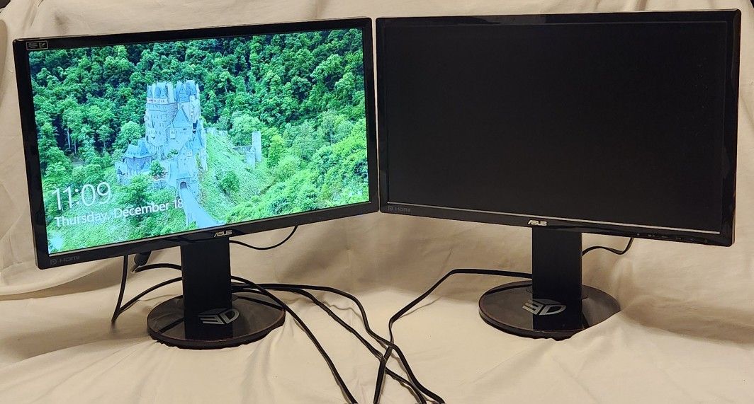 Pair of ASUS VG248QE gaming monitors 1920 x 1080 Full HD 1ms Response Time 144Hz Refresh Rate HDMI, DisplayPort, Dual-Link DVI-D Video Inputs Built-in 2 Watt Stereo Speakers NVIDIA 3D Vision Technology Asus Eye Care with Ultra Low-Blue Light and Flicker-Free Technology Tilt, Swivel, Pivot, Height Adjustable VESA Mount Compatible Awesome for gaming