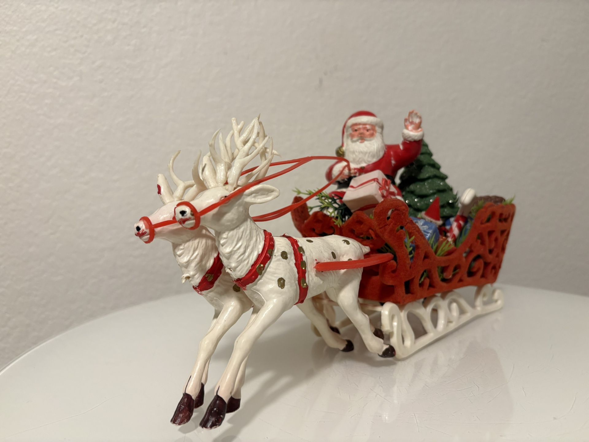 Dimensions: 12” Long x 4 1/2” Wide x 7” Tall Wow! Rare find. This vintage decor with Santa in a full sled with 2 reindeer. Plastic. In good vintage condition. Pickup location is near N. 60th Street and Greenway, Scottsdale.