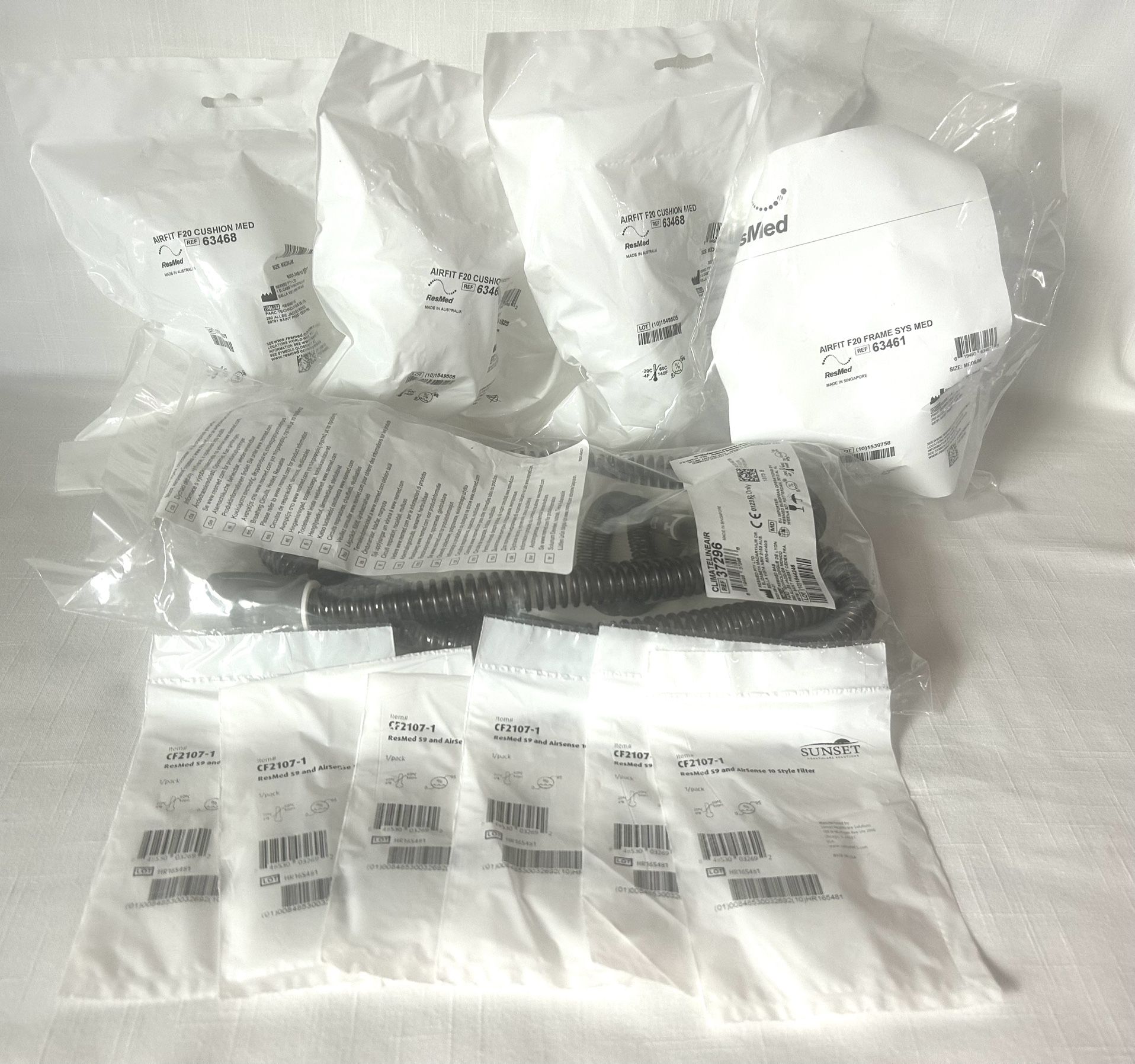 ResMed bundle includes: 1 - Airfit F20 Frame Sys, Med 63461 3 - Airfit F20 Cushions, Med 63468 1 - ClimateLine Air tubing 37296 6 - S9 & AirSense 10 style filters CF2107-1 All items are brand new, in original unopened packaging. Local pick up , cash only please.